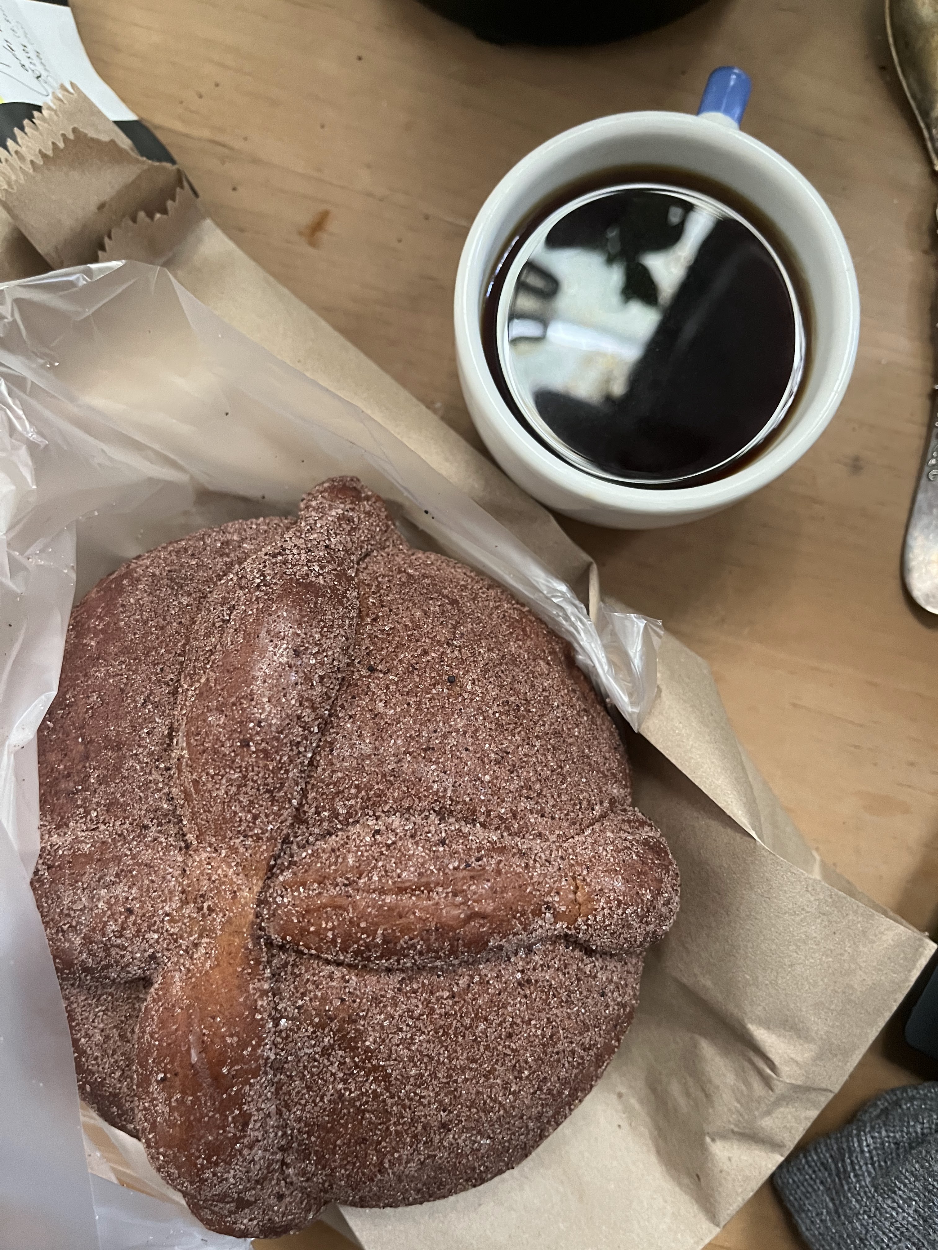 There’s a bakery up the street from the Airbnb in Coyoacan and the smell of sweet bread rising and baking fills the street in the morning, albeit at times intermingling with some distinctly less pleasant smells. While in general, I strongly favor the traditional pan de muerto, this chocolate rendition is sooo good. The bread itself has trace amounts of cocoa powder in it, but the sugar on the exterior has these chunks of little crunchy chocolate goodness. It’s only around this time of year and is an extremely soft enriched bread that more or less melts in coffee in the best way imaginable.