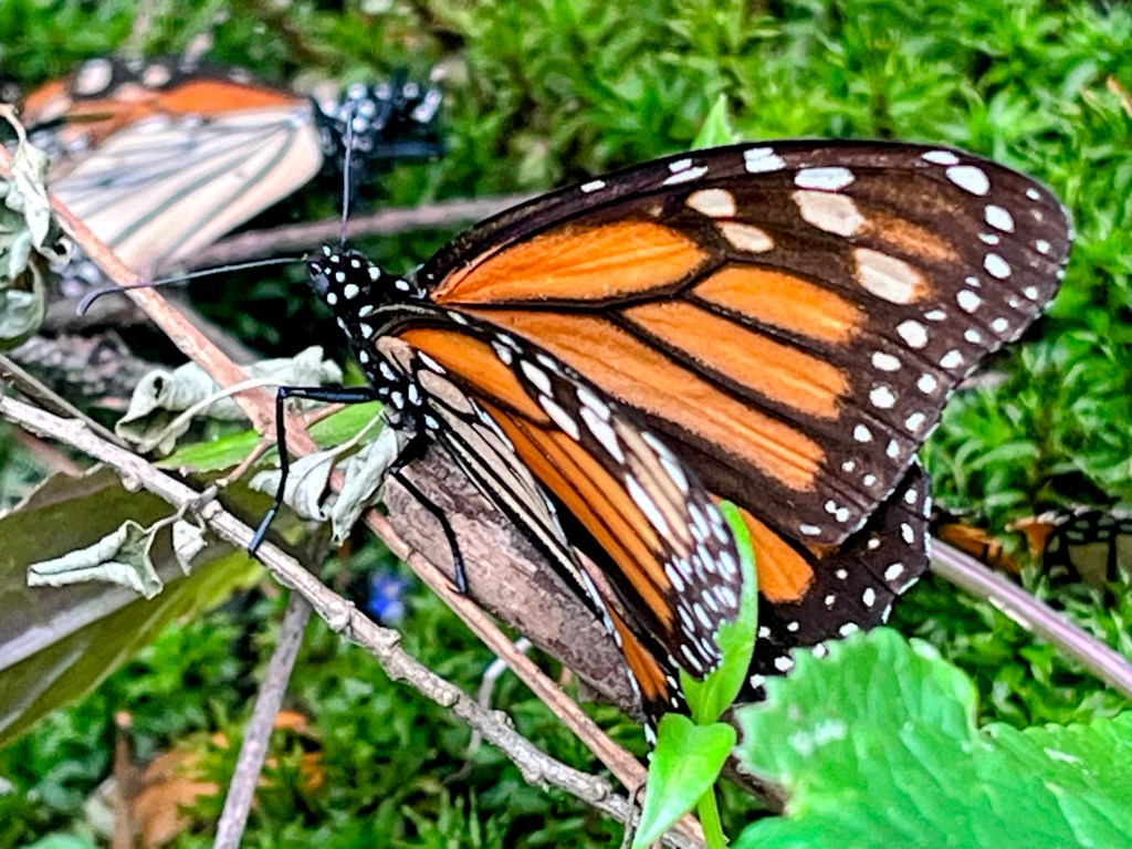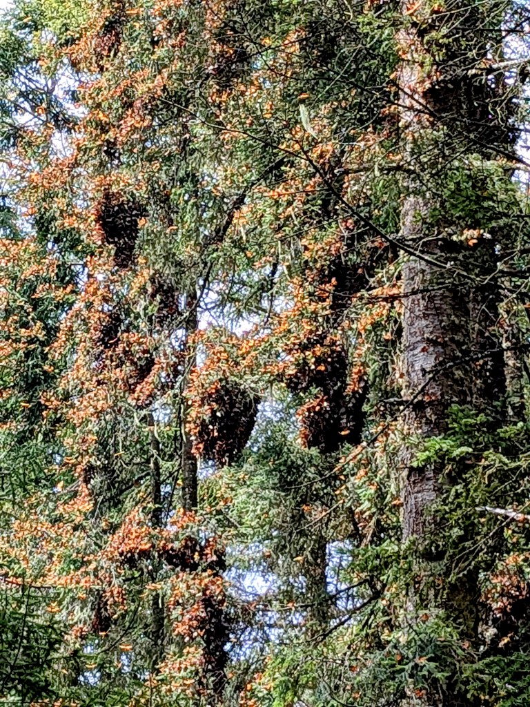 We spend an hour silent, looking up, waiting for the sun and subsequent frenzy of butterfly flight. Between bursts of sun the butterflies land, packed in on tree trunks and branches. Everything orange is a butterfly.