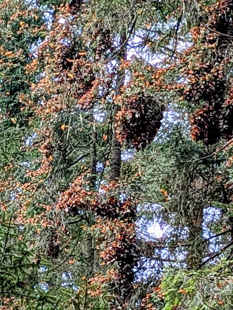 And then we walked and walked and walked up hill. Most of the way was best described as on logging roads, the forest interrupted on occasion by small farms, one tilled field and a tin roof slapped on an out building. We branched off to a narrow trail. At this point, we’ve been going very uphill at around 9500 ft and nary a butterfly. But then as Moni ran ahead a flurry of butterflies flew up in the air around, dancing in the sun. A bit further in we found them. Cluttered heavily, weighing down branches, their wings closed exposing the light orange and brown side of the wings. They favor the oyamel trees on the sunny side of the hill. The sanctuary is rustic, simply a clearing with logs and neon pink tape marking the off limit areas, handwritten signs warn you to watch your step for butterflies underfoot.
