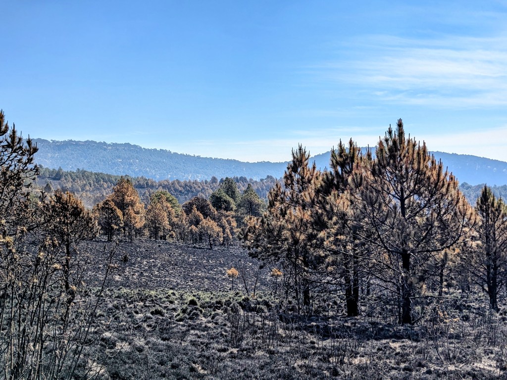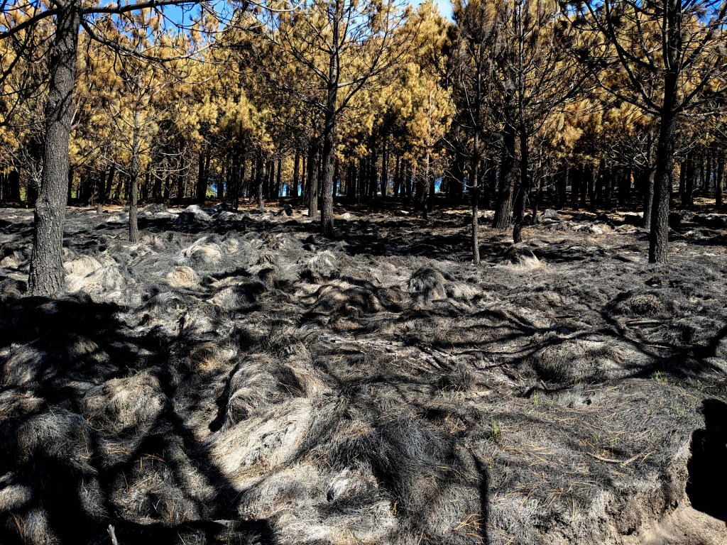 You start in a pine forest, these are low trees maybe topping at 15 feet, but plentiful. Some type of sedge fills in the rest. The trail is dusty as can be, but well traveled and easy with a gentle incline. This is the beginner’s hike after all. Then you hit a burn scar that’s sad, but beautiful. It’s not like the burns of heavily wooded forests, it’s stark and draws a sharp line with blackened sedge. We continue trekking onward.