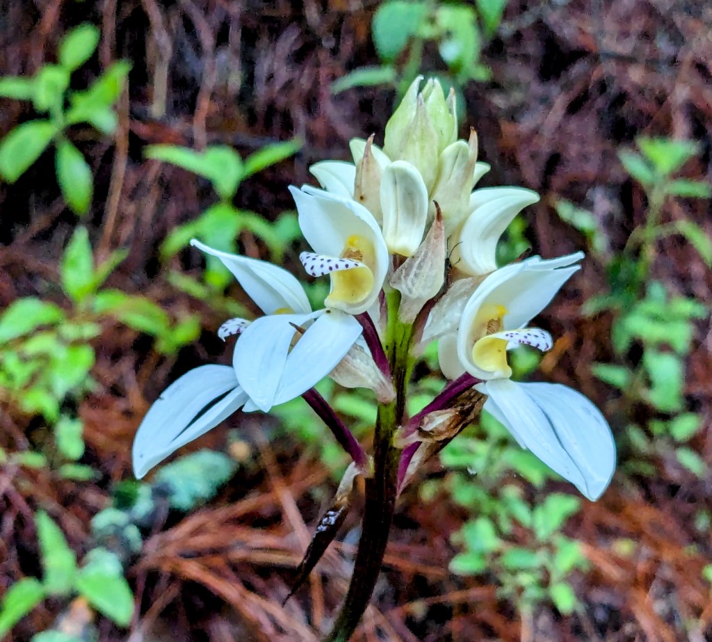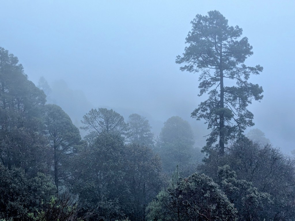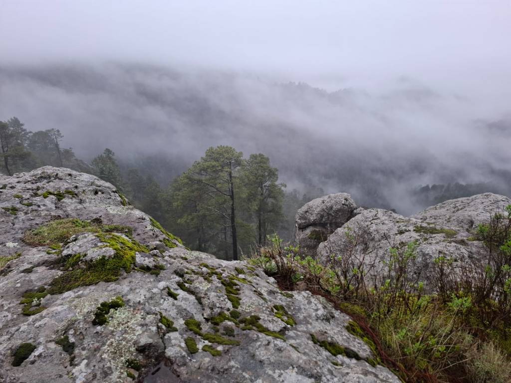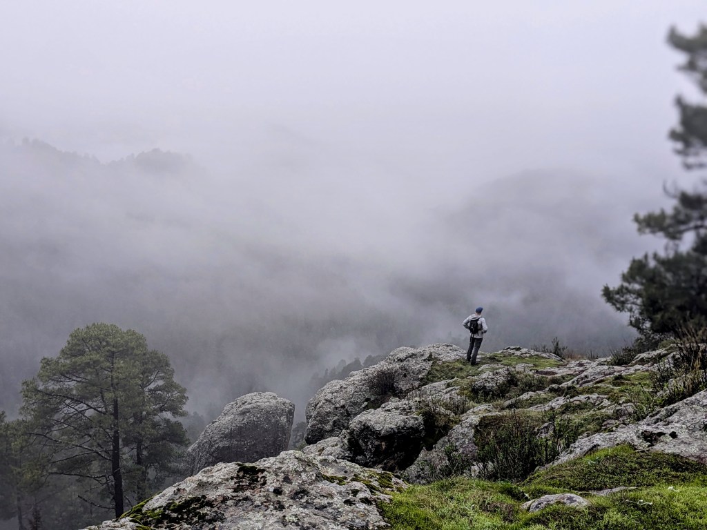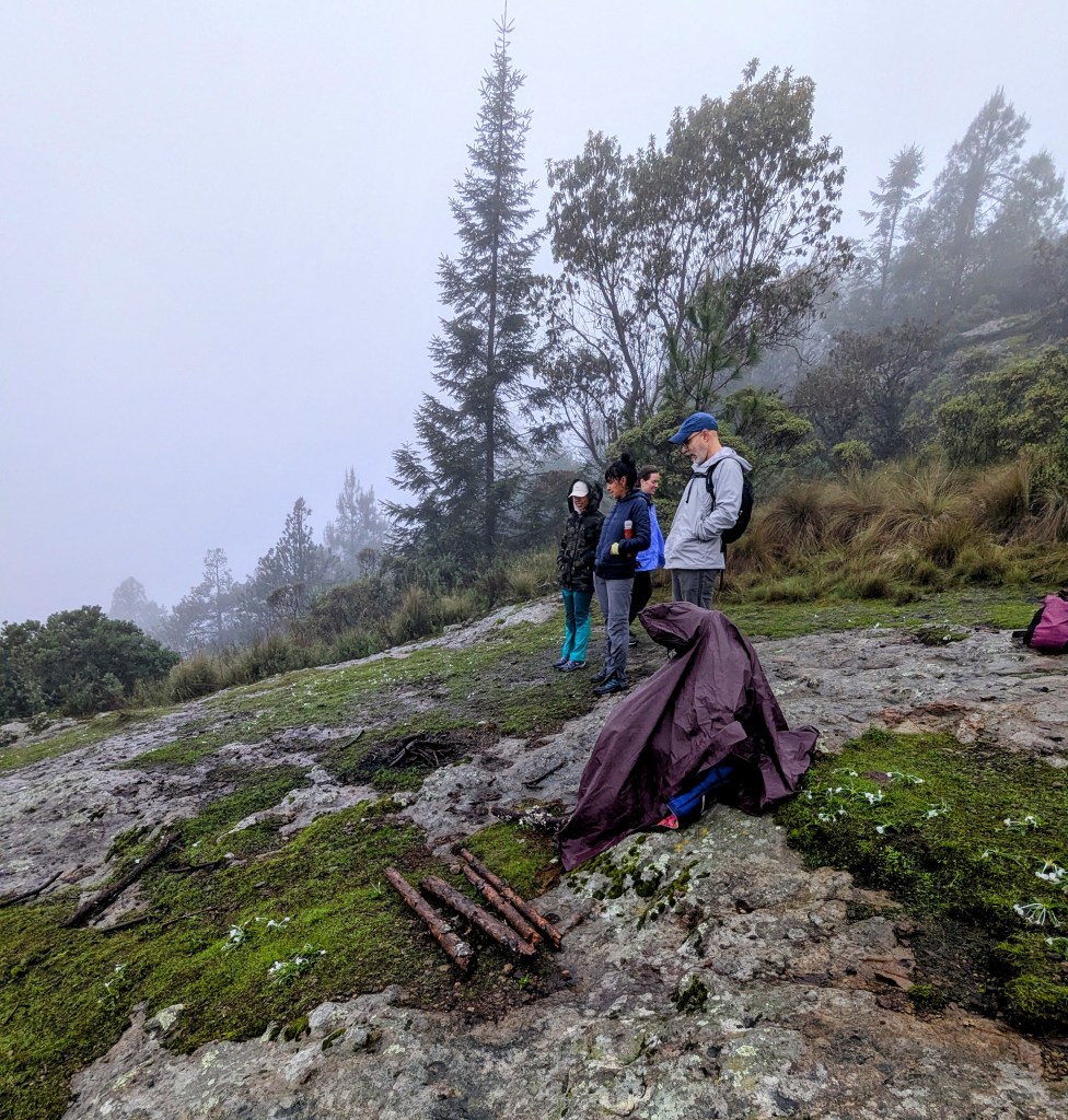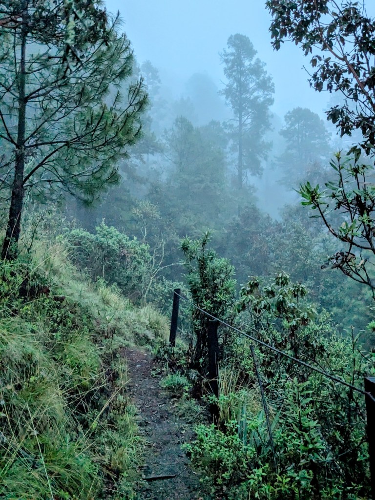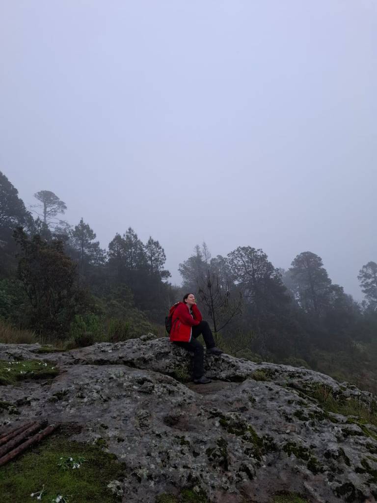 And 3:45am comes quick. We all got ready quickly, the cabins are largely windows which provides an amazing view, but also very little protection from the cold. It was cloudy and gently raining when we headed out in the dark. I’ve never hiked in the morning dark before, it’s so quiet and slightly terrifying before the birds come out. We walked largely in sleepy silence following our headlamps through sharply crisp air. The light began to appear about an hour into our walk and the trail accordingly narrowed and grew steeper. Fuzzy outlines of trees appeared coated in morning mist and further up we went. We reached our view point, which apparently generally offers a pretty stunning vista of Nevado de Toluca, the 4th highest peak in Mexico, but this morning afforded us a dense cloud cover. The clearing was speckled with these nearly translucent white flowers that apparently only grow here and we were advised to try not to step on them, which in some places was indeed a challenge. A quick rest and a quick snack later, we ascended to our final point of Peña Blanca, hitting just shy of 11,000ft. The last stretch was quite the up hill scramble. And this small group was comprised of Liz (ya know the mountain climber), Adam (the other mountain climber), Liz’s niece Jackie (mountain climber in training), Michelle (does energy work to enhance top performing athletes) , Moni (this is her home) and then me. Needless to say, I was the weakest link. But I made it, step by fucking step, I got there.