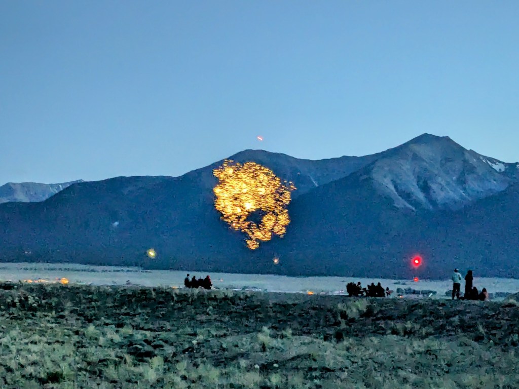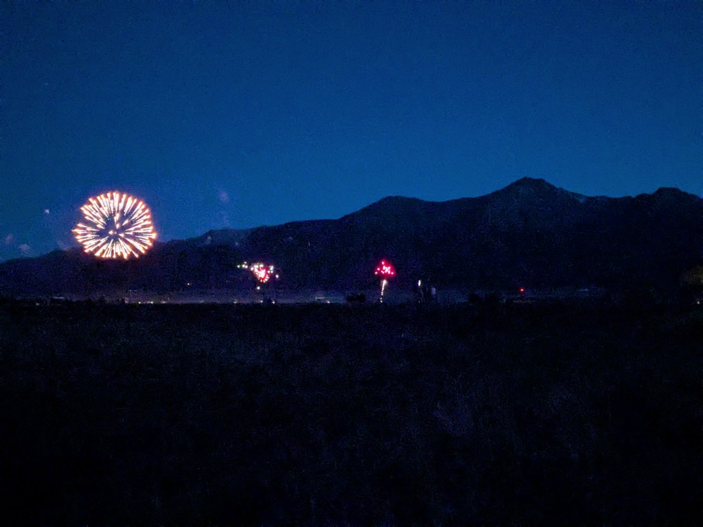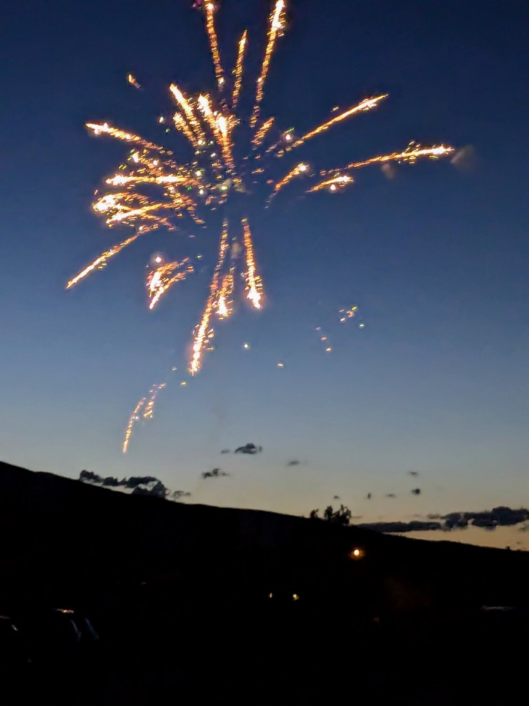 Then we set off for firewalks. Heidi had read that fireworks would be set off at the rodeo grounds, but initially we thought we’d have a view in town. So we started off in that direction and then noticed a constant stream of cars in the opposite direction. We pivoted and doubled back to the car to follow the herd. Less than half a mile into our route, we noticed a lot full of cars with folks set up to watch from there and decided to pull on in.
