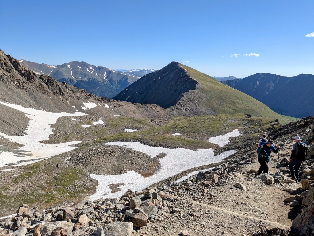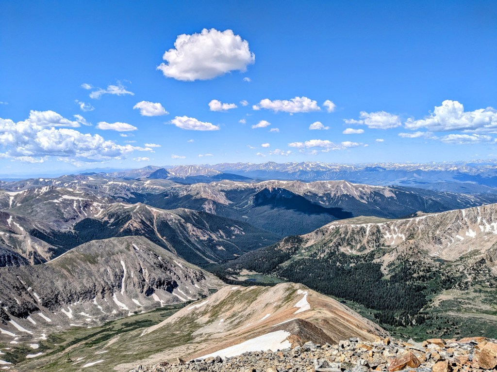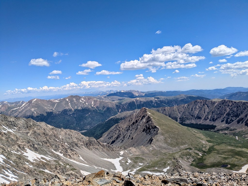 This section was definitely more work and less beautiful than further down, but the people happily descending from the peak always offered a good morning and words of encouragement. By the time I hit 13,700 I think I was going largely on determination. My legs weren’t exactly tired, but they were heavy. I could feel my heartbeat. I was not going to freakin’ turn around at that point. So step by step, gravelly switchback by switchback, I got there and was rewarded with an incredible view of the Rockies. It seemed like nothing else existed in every direction but this wilderness, pristine in appearance from on high. I was lucky that day to have clear skies and no lightening, just a very mild breeze pushing some much needed air my way. More than anything, nature momentarily makes me believe in the divine.