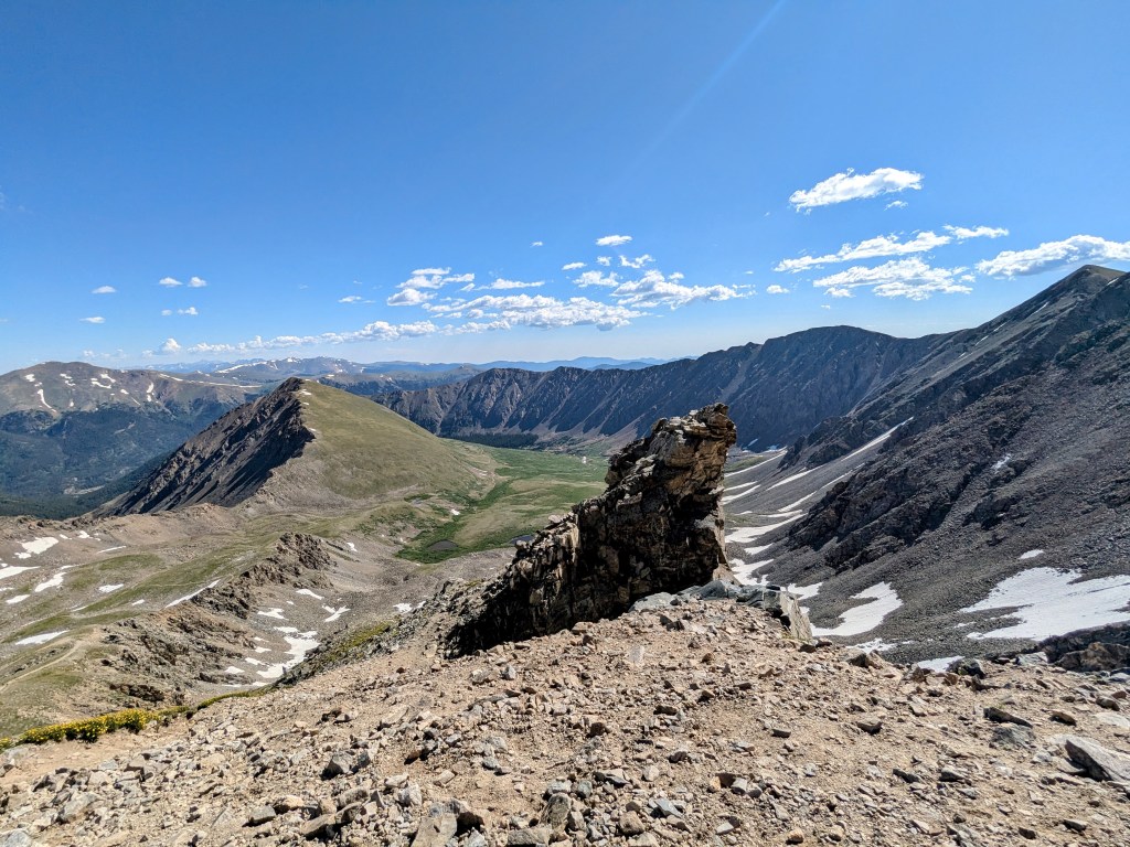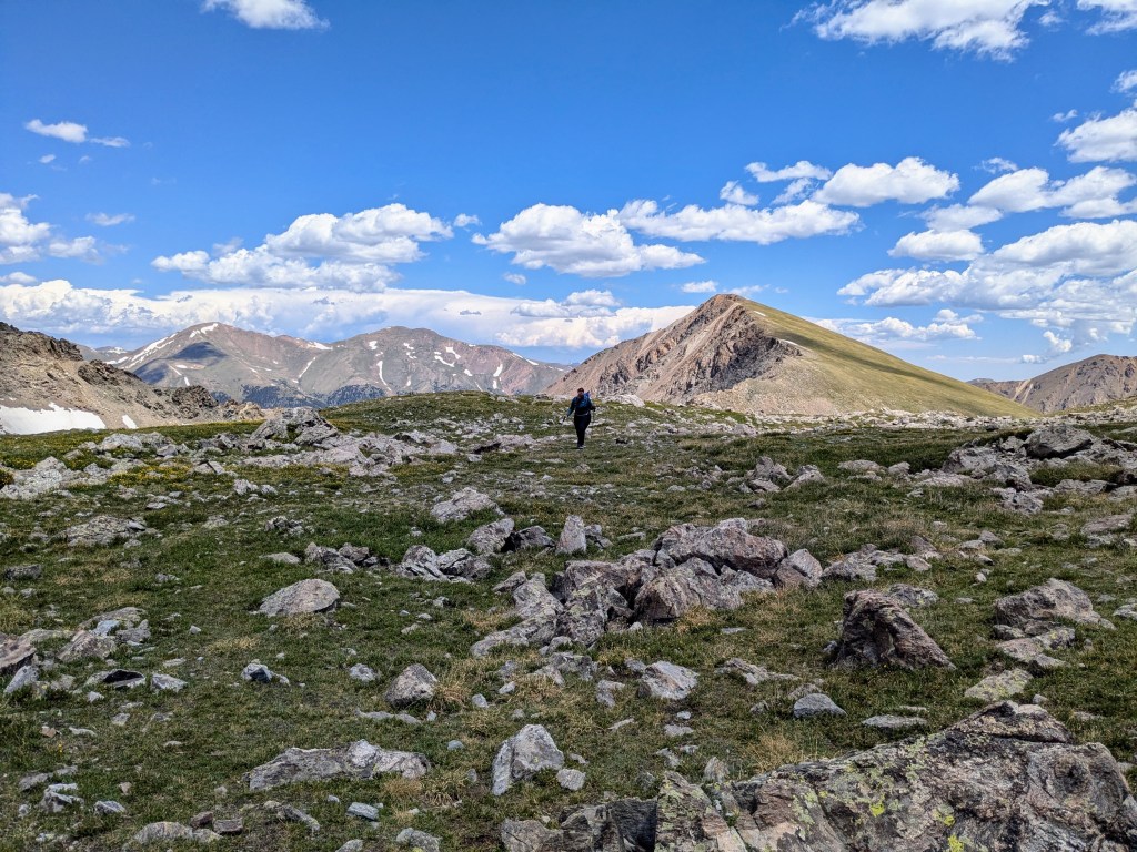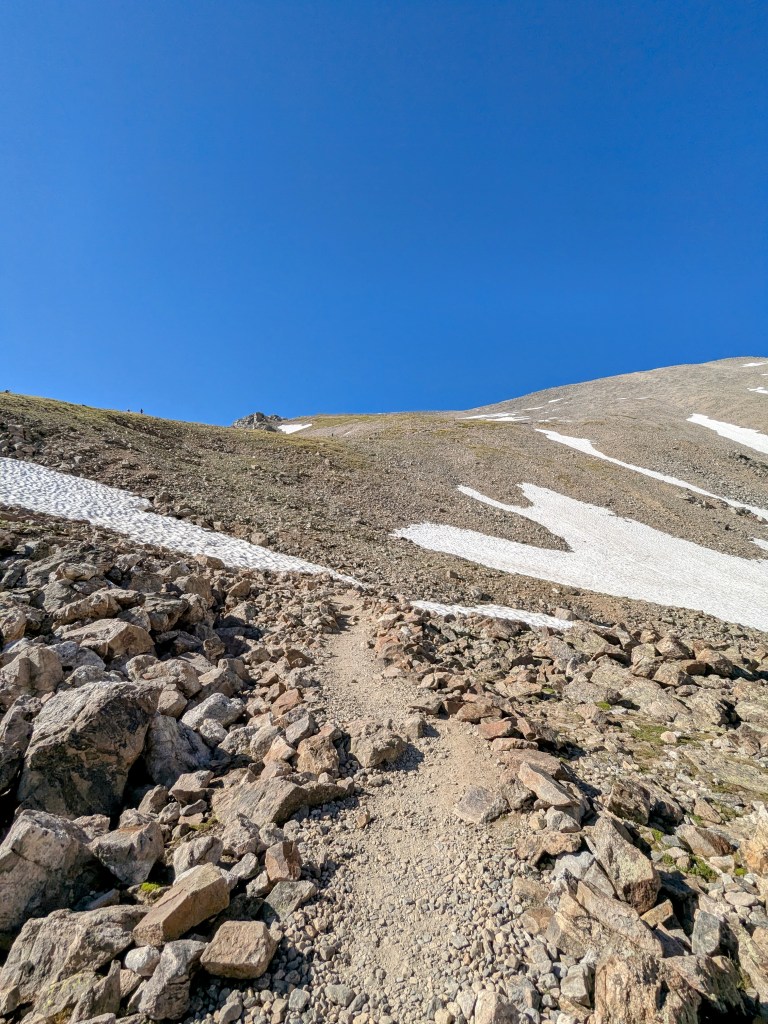 This trail affords an opportunity to knock out two 14ers for the price of maybe 1.25 in a lollipop style trail. Grays & Torreys are separated by a high saddle and then descend/ascend on their separate paths. Jenny and I were definitely ready for the trail split signaling that we were getting at least close. And finally we saw it up ahead, emphasis on up, and through a particularly rocky section where you leaned a bit into the hill and chose footing carefully balancing from rock to rock. Jenny opted to take it super slow and encouraged me to mob ahead.