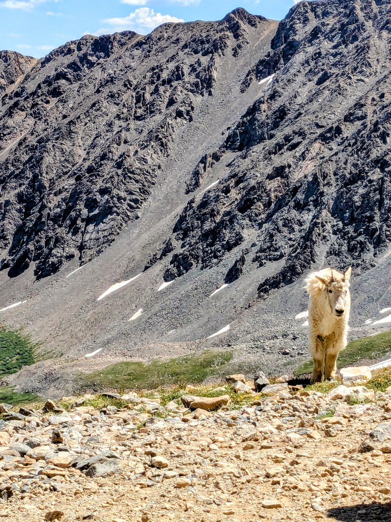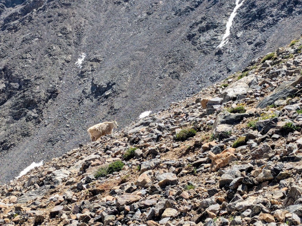 Thoroughly exhausted, I extended my poles and headed back down. Harder on the knees, but oh so much easier on the cardio. On the way down a few folks pointed out goats MUCH further down and I had to work to reel myself in with reminders that I would never catch up to the goats with a sprained ankle. And finally, I came upon one. For those of you who don’t know, I am generally inordinately excited to see wildlife and if I think the possibility exists, I have already spent a good amount of energy prepping myself for disappointment. In fact, I’m not sure I would’ve continued up the mountain except that I hadn’t yet seen a mountain goat. To get both was incredible. I could see a group of goats, really tiny whitish dots that moved, in the middle of the trail below, so I continue to descend with care, although the compared to my pace on the way up, I was practically sprinting.