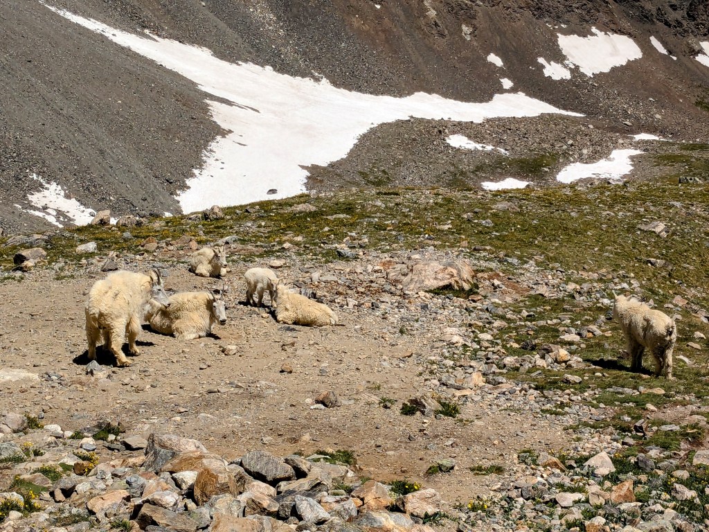 Carefully, but impatiently, downhill, past dogs and hikers. Carefully over slippy scree. Carefully through the down hill awkwardly spaced and inconsistent in height stairs, carefully over the rocky area (omg I love my poles) and then there they were. Just chilling on a flat part of the trail where it opened to a resting area bordered by short grass, a family of 6, featuring 2 adults, 3 juveniles, and a baby!