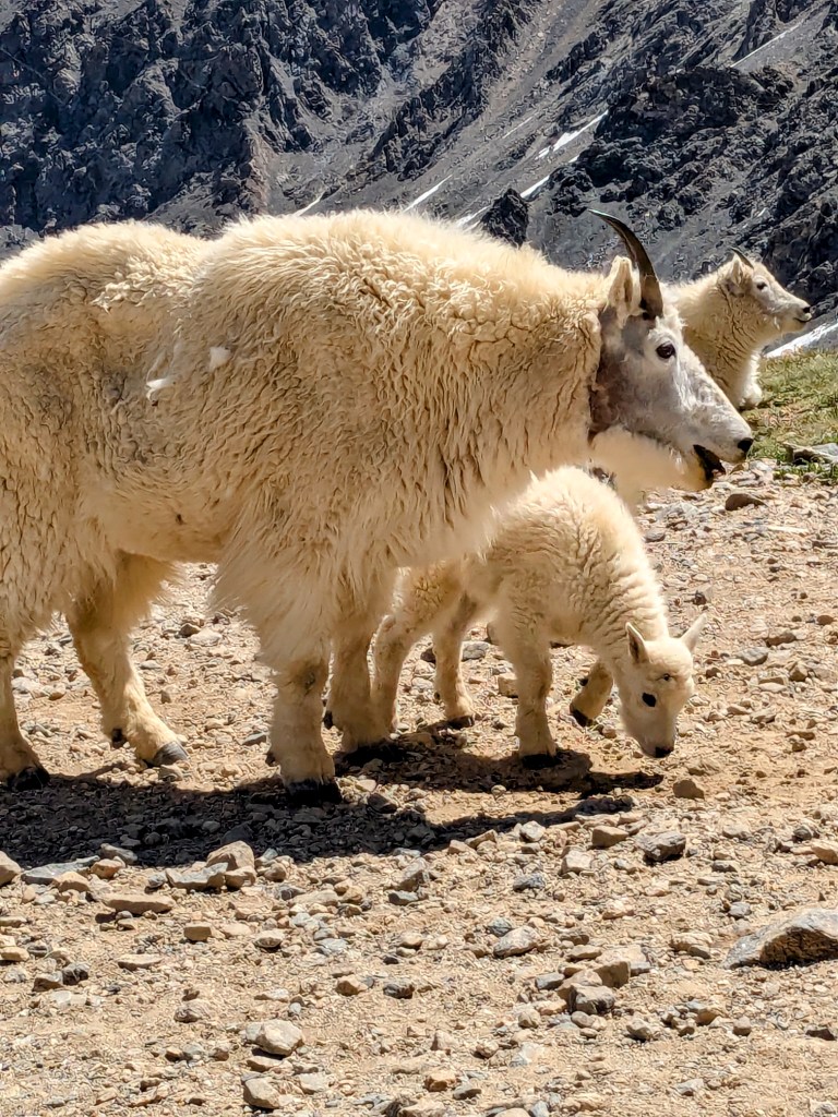 So these goats are not remotely people shy. There is not much of a zoom here. I was probably within 10 ft of them. They showed no sign of concern at the stream of people passing them or snapping their photos. Even with the baby. They were shaggy but healthy looking goats, just doing their mountain goat thing.