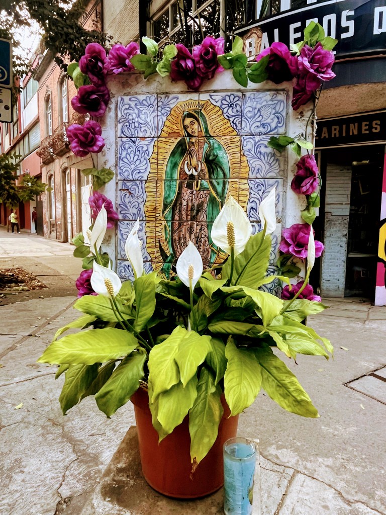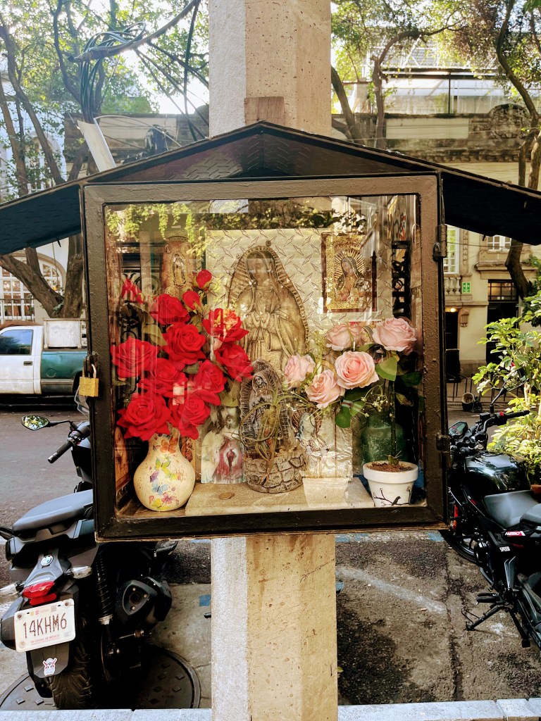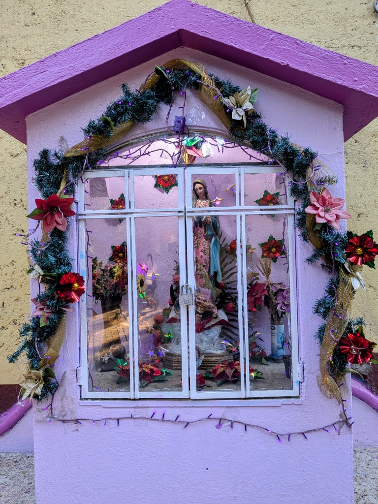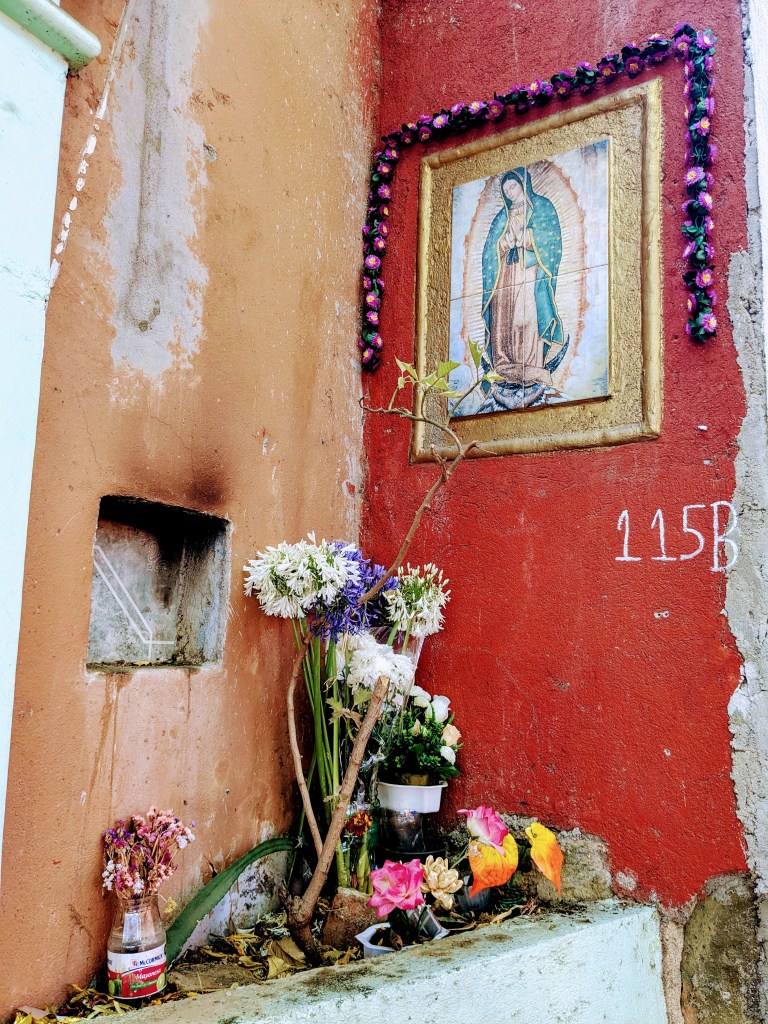 One of the other ways the Virgin shows up is in “nichos” which are somewhere between our shadowboxes and the little, adorable free libraries that litter Portland. These are about every third block and are always little bright spots with fresh flowers and a gentle presence of a benevolent deity.