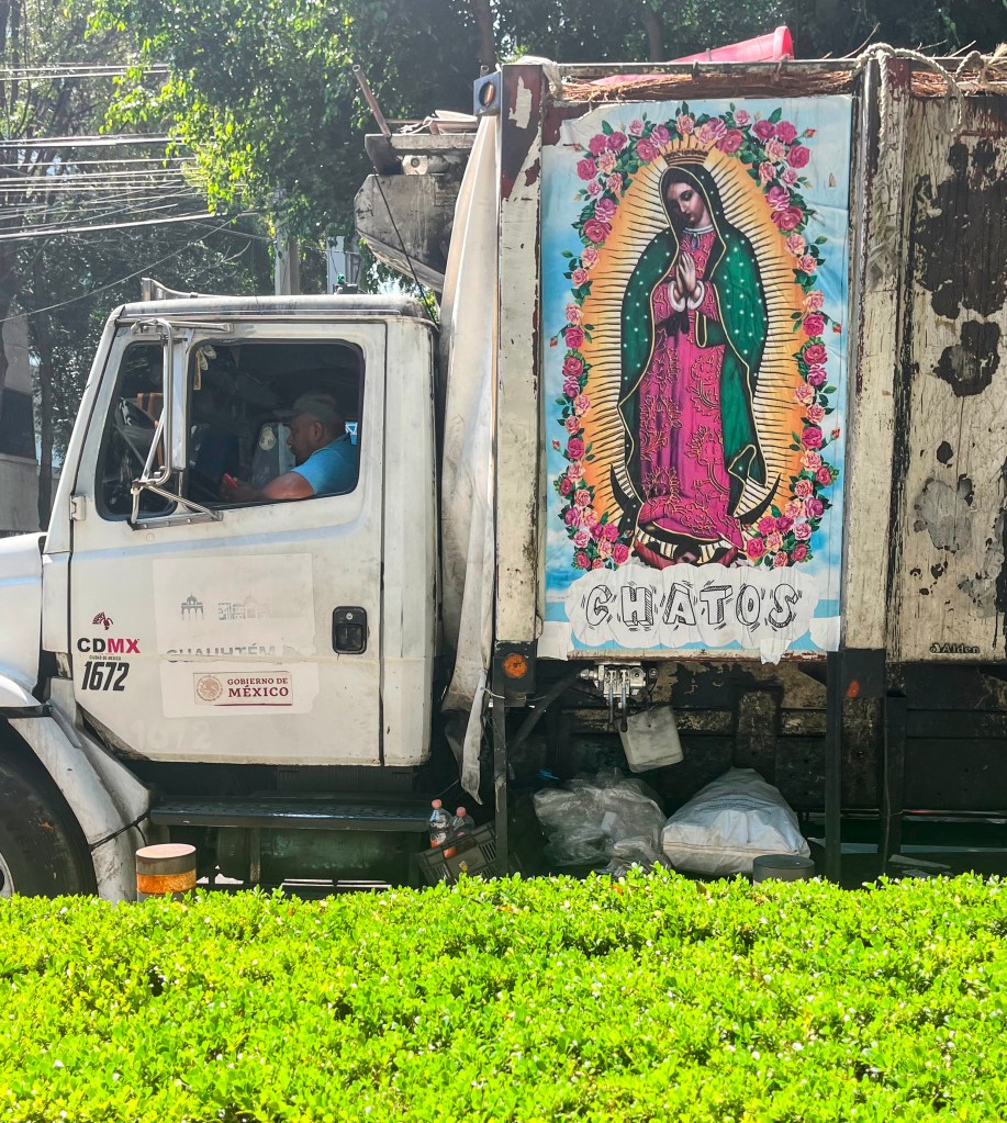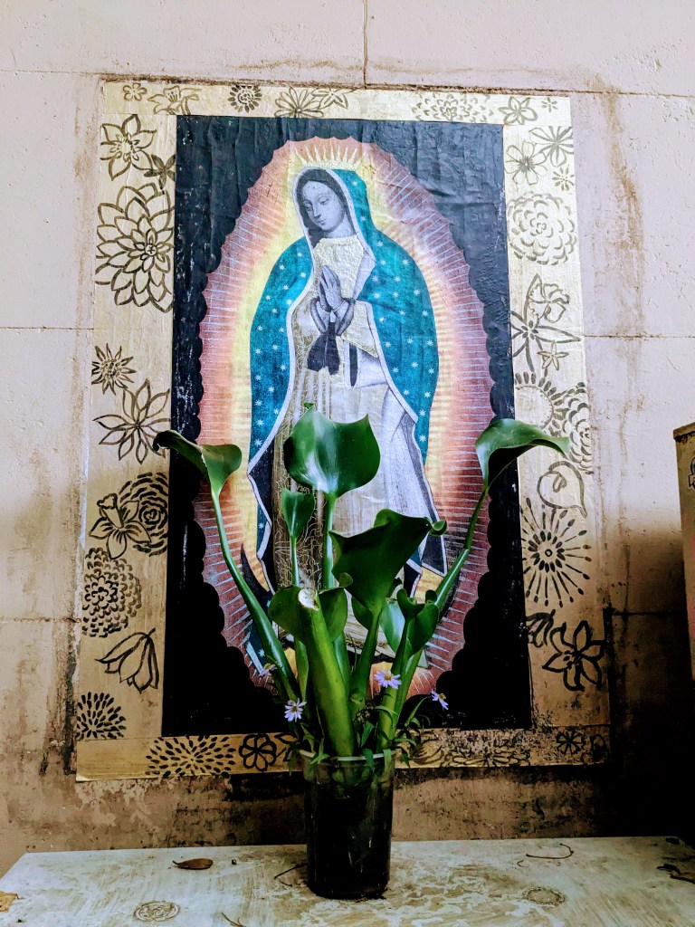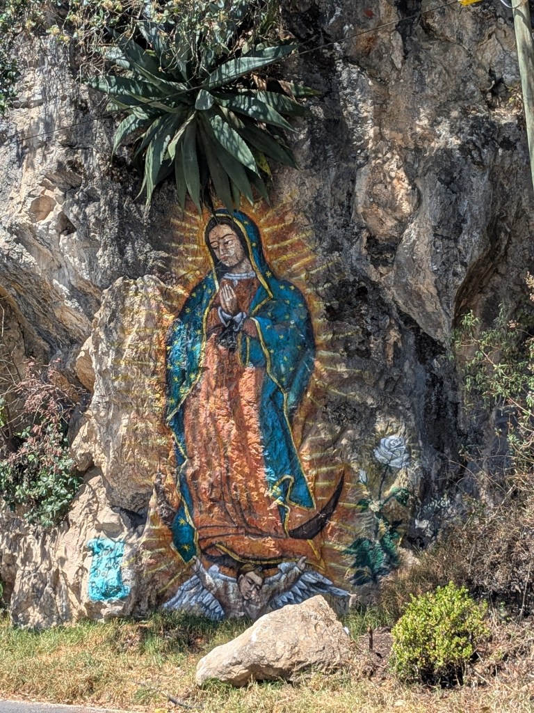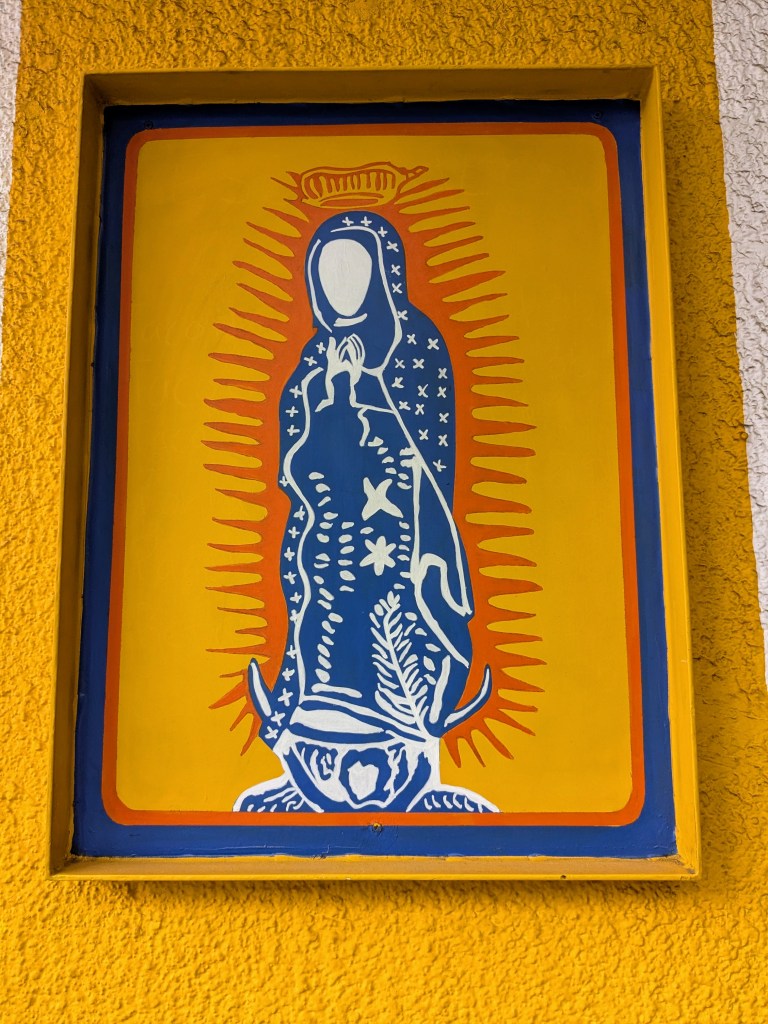 She’s distinctly Mexican, differentiated by mestizo features and skin tone, a turquoise cape (a favored color of Aztec royalty), and is always depicted with a sunburst behind, as though she is emerging from the sun. She was a symbol in the rebellion against Spain and again during the Revolution against Porfirio Diaz. She is for the people, a crusader for social justice and has been the patroness of Mexico in 1746. In some ways, she represents all the differences I find in Latin American Catholicism and the version practiced in the US, the living practice of religion here, it’s emphasis on “do unto others”, rewarding the meek and downtrodden, and always and selflessly on the side of right. And she’s ubiquitous here.