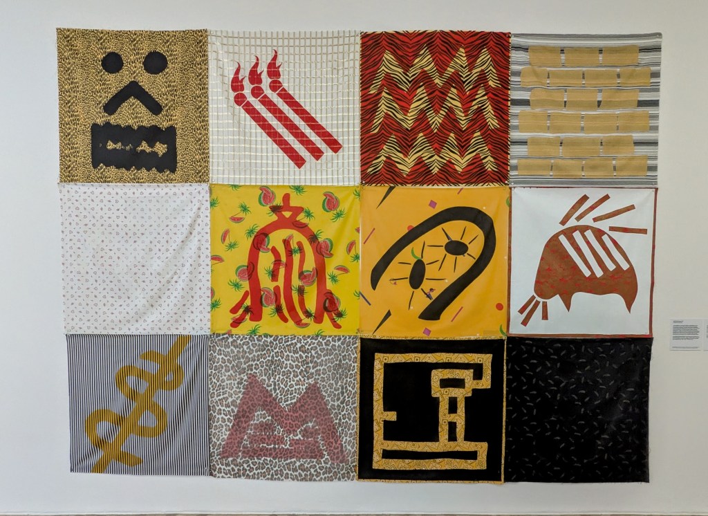 It’s a low slung concrete building in Parque Tamayo, near the Anthropological Museum undergoing some construction. The first exhibit was entirely work by Tina Girouard (1946-2020), an American artist that I was completely unfamiliar with. She was the first female artist to be featured at Museo Tamayo in 1983. Her work evolved hugely during her lifetime. Born in Louisiana, she moved to New York in her mid 20s and was part of a post-minimalist scene, a vague sort of collection of visual artists and musicians who frequently used every day objects in their art and often seeking to imbue a sense of the human into the work. She was a founding member of FOOD, which if you haven’t read about, is kinda fascinating. Her work included performance art, creating spaces from household items, and video. Tina Girourd created a system of hundreds of symbols representing different things such as house, death, conflicting evidence, and Tina, frequently printed on fabrics and sewn together, as shown below, in an effort to create a universal language.
