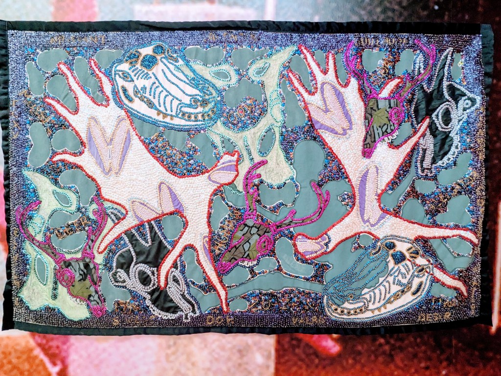 She moved back to Lousiana after about a decade in New York and continued her work, focused on fabrics embedding her language. She later moved to Haiti and partnered with Haitian artist Antoine Oleyant to create a series of images made entirely of sequins. These are good sized images, most measuring at least 3×3, with an unbelievable number of sequins involved. All bright and shiny.