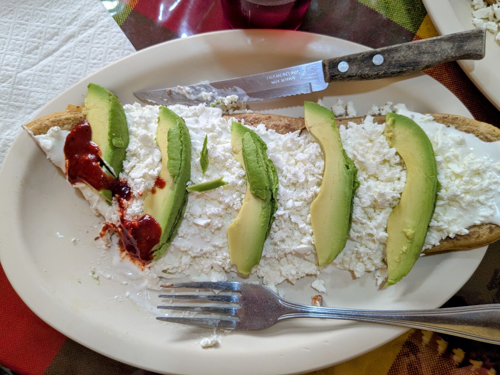 Fran’s partner, Gus, had recommended El Huarache Azteca which is about a block away from the mercado, so we met up with Fran at the restaurant. Huaraches are vaguely football shaped masa (or the sandal for which it’s named if you prefer), usually stuffed with beans and then with stuff on top. Stuff can be a giant slab of meat, chorizo, or in my case crema y queso con aguacate. They were enormous and we were stuffed.