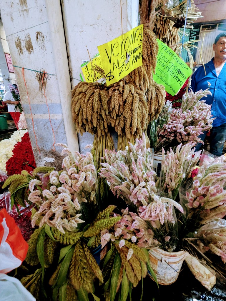 Then we wandered into the mercado. There is a smallish food section, focused on produce where I picked up some beautiful looking hoja santa and some copal incense. Huge pinatas hung over head, some were turkeys, some were cans of beers and some were giant stars with streamers. Sherry’s birthday is next Monday and I think we are all now committed to having a pinata on my patio, there was talk of filling it with glitter and rose petals…. And then the flowers. Rows of flowers. Then rows of massive bouquets, like no longer bouquets, but now fixtures. A sign hanging over mounds roses reading 6 dozen for $100 pesos (aka a little over $5). Rose petals in bags, and not small bags, we’re talking at least a bucket of rose petals. Roses come cheap in Mexico. Most of the flowers were the standard ones seen in Mexico, nothing too exotic, but there are a few vendors who have heliconica, hedychium, and tropical gingers. Little posies of gardenias were going for 20 pesos, I bought two. Big branches of dried blooming grasses were 70. It was lovely. Although the ranunculus was inexplicably expensive, but I’d never seen the butterfly ranunculus before, it looks like a cross between a rose and a poppy with less tightly bound petals.