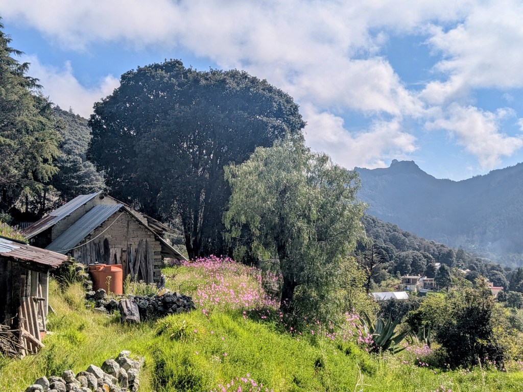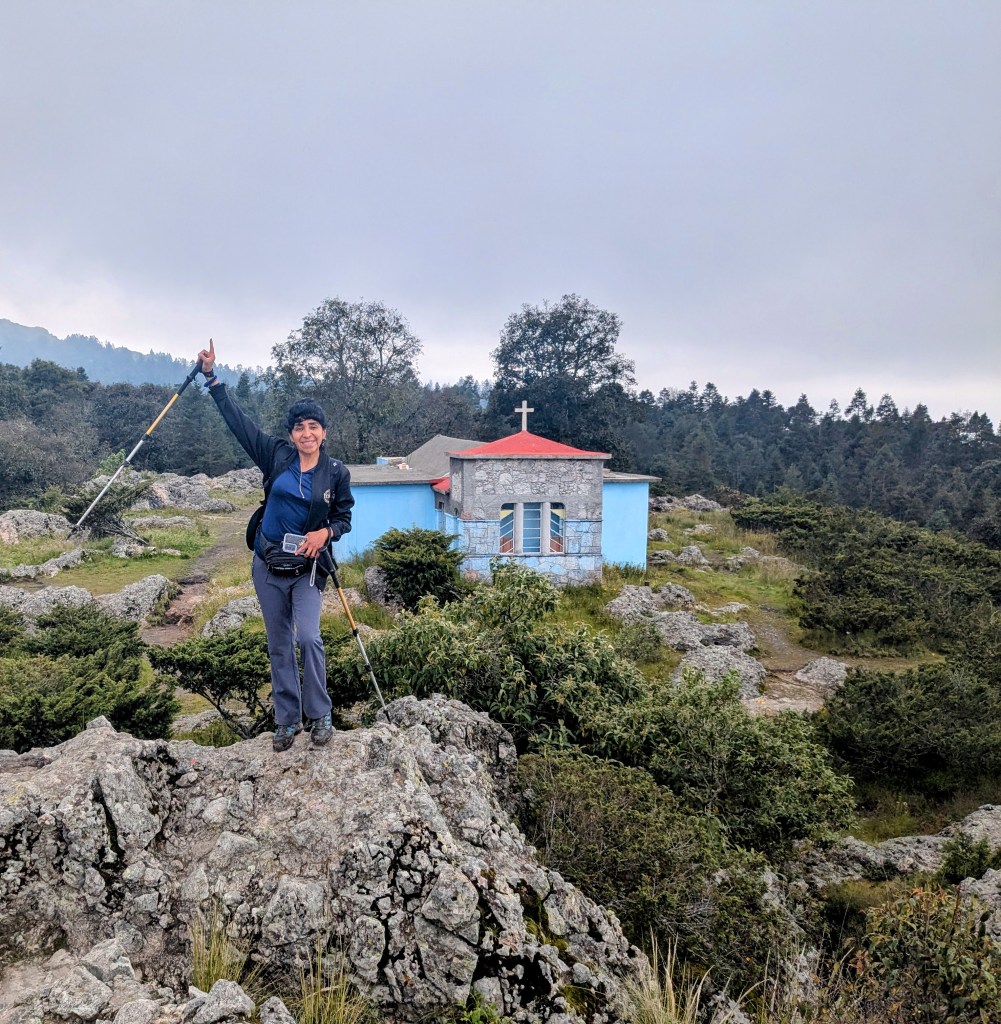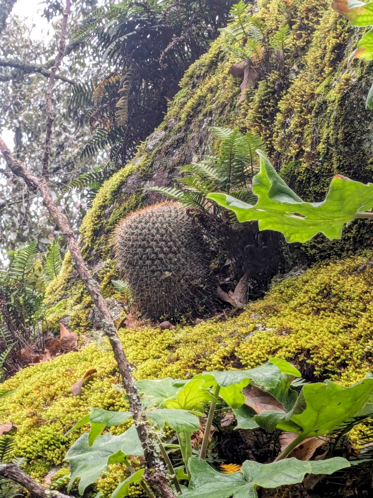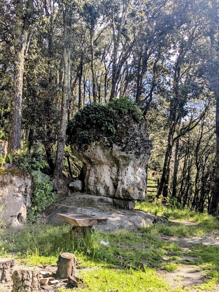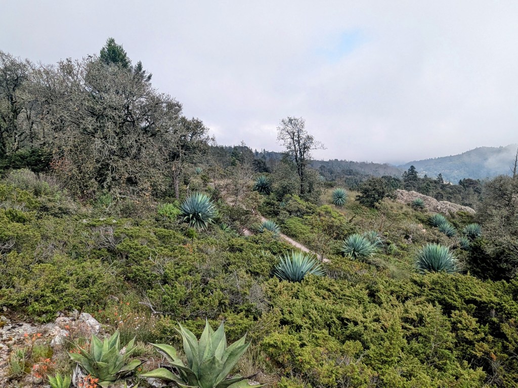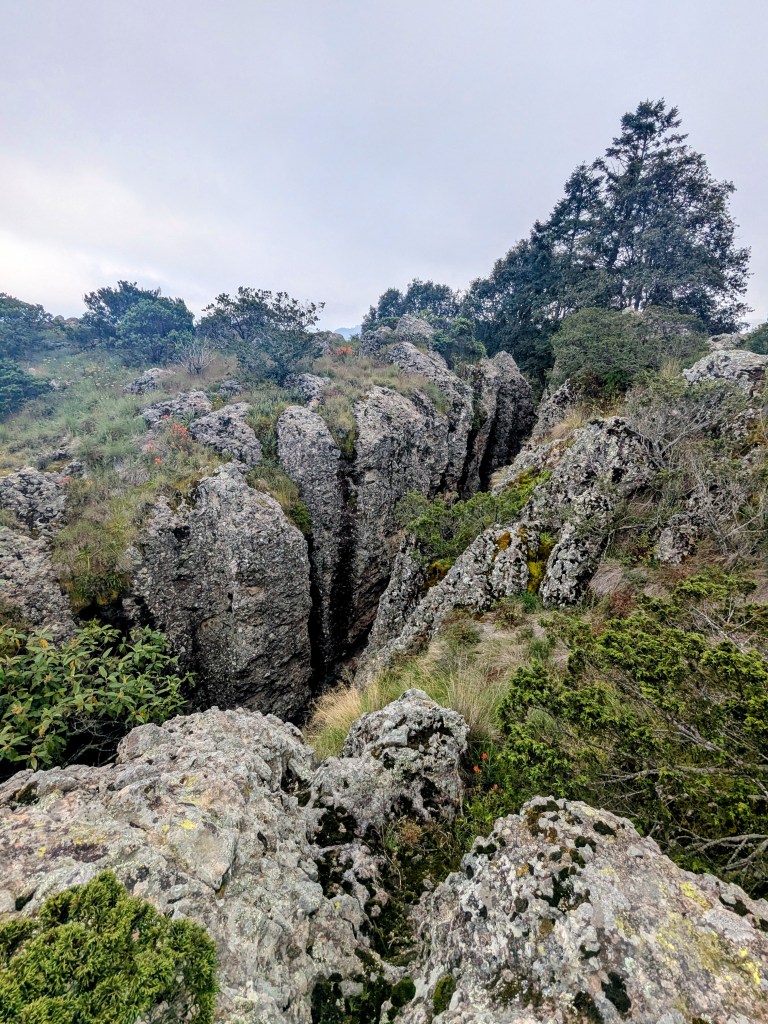 And then we were at the the top. It was a bit cloudy, but the air was delightfully crisp and the landscape a bit sparse, with short trees, cactus dispersed on the ground like anemones, large agave and wildflowers. It was cool and refreshing and still quite early, so onward we trekked. But not exactly upward and sometimes not exactly on a trail. But we kept trekking. Then we came upon a large opening with parking and restaurants (ok, these are very much open air and they feel too common & too organized to be called shacks per se, but it’s not an inaccurate description) and toilets better left unused. We handed over 15 pesos each to continue up the stairs built into rock at one end of the clearing.