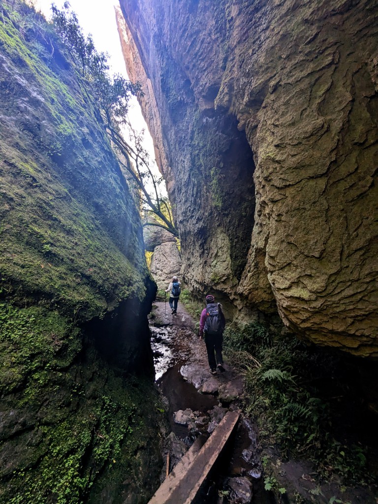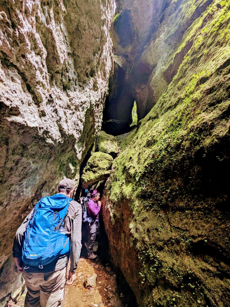 This rocky terrain had deep crevasses in it to land below and we trailed our way through the rocks, and down a ladder into the spaces below. Carlos went ahead testing tight cavernous squeezes through rocks for water and access on the aside before doubling back and urging us ahead or seeking a new route. It was super cool. It also involved occassional crawling. Sometimes in water.