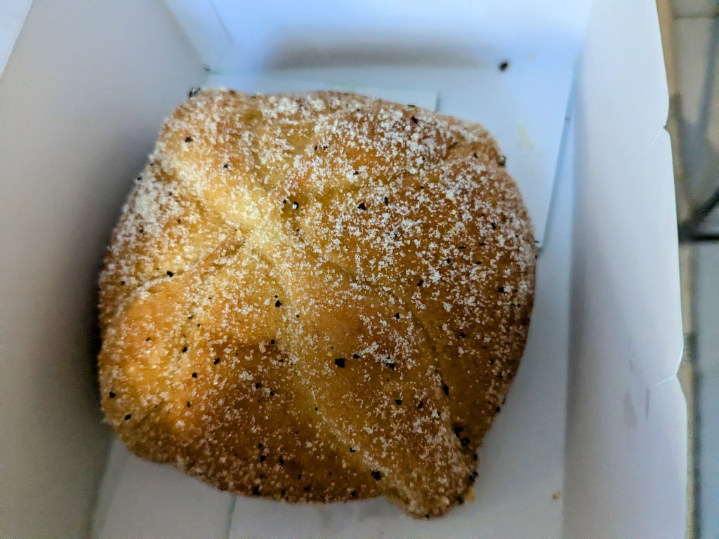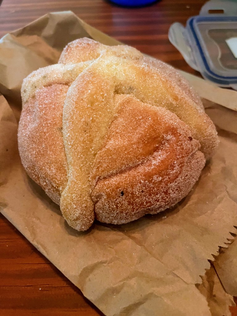 This week I ate my first and my second pan de muerto. And I started off at the top with a pan from Panaderia Rosetta. This is a delightful and fluffy sweet enriched bread that is only available this time of year. It’s shaped like a bun to represent the eternal cycle between life and death and topped with crossbones to represent the departed. There are many variations on this, but clasically it’s topped with a bit of granular sugar and will practically melt in a cup of coffee. Various renditions include matcha, orange glaze, powdered sugar, chocolate, sesame seeds, you name it. If you’re in Portland, think the gibrassier from Pearl Bakery, although the fennel seed is not common here. But the lightness of this bread would warrant it.