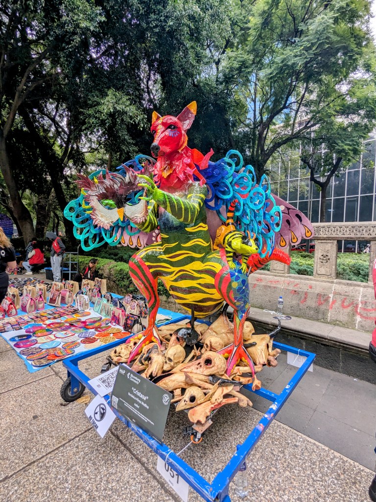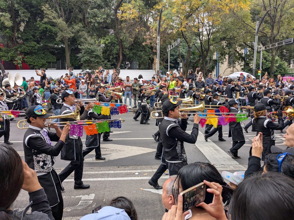 Alebrijes are mythical creatures or spirit animals brightly decorated. Not initially connected to Día de Muertos (Día de los Muertos in the US) whatsoever, they’re actually a pretty recent art form, developed in the 1930s by Mexico City artist Pedro Linares. In Oaxaca, they are made of wood, here in the city they are commonly the most elaborate form of papier mache I’ve ever seen. You can buy them all over the place in various styles, degrees of detail, quality, size, material, and, correspondingly, price. But the ones in the parade are a whole other beast. These alebrijes are instead of having floats. They’re big and set upon trailers to roll down Avenida Reforma. The parade is hosted by the Museo de Arte Popular and combines the talents of master cartoneros (papier mache artists, yes it’s a whole job here!) with emerging artists from across Mexico to create elaborate and fantastical alebrijes. Like most parades, there are also marching bands, usually from high school, and the regional dancers often accompany an alebrije made in the tradition of the represented region.