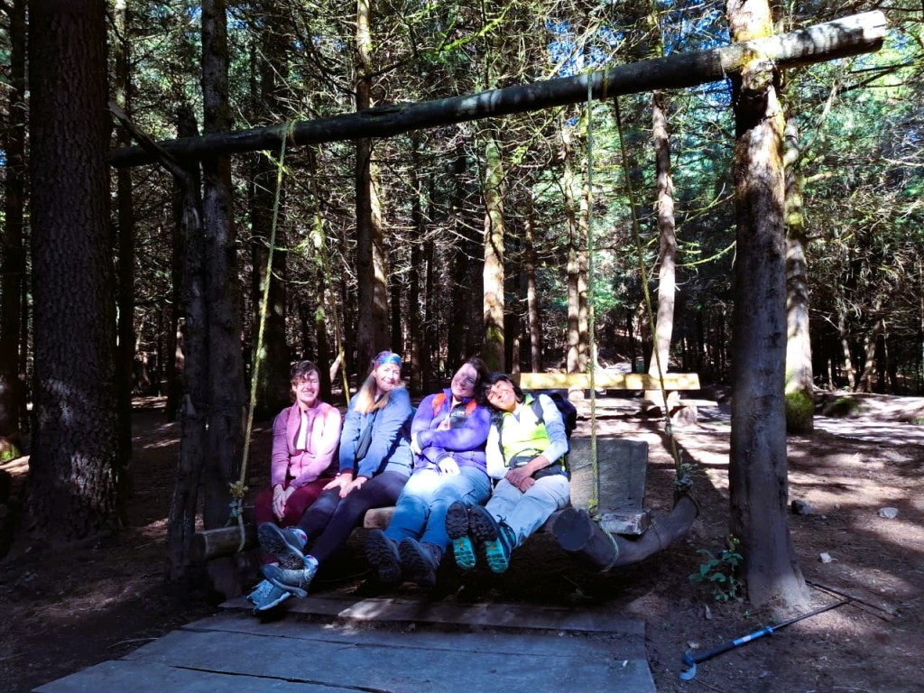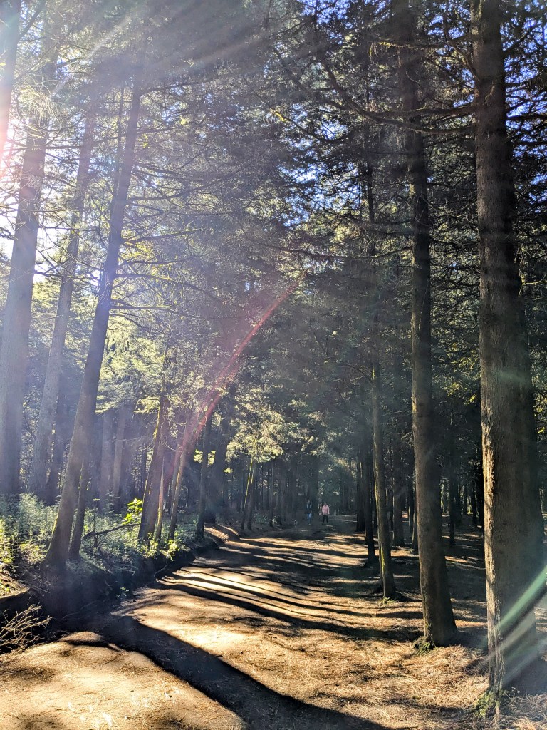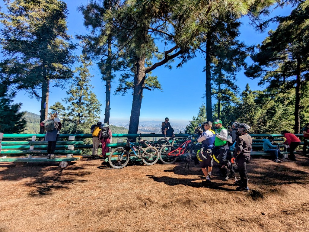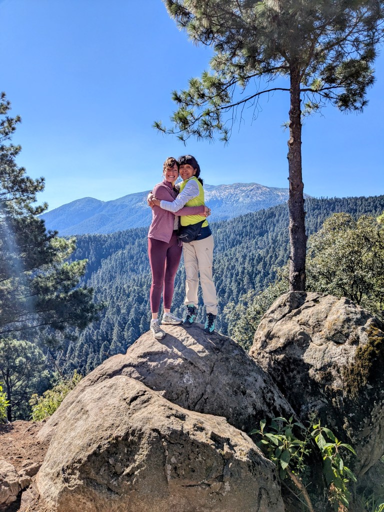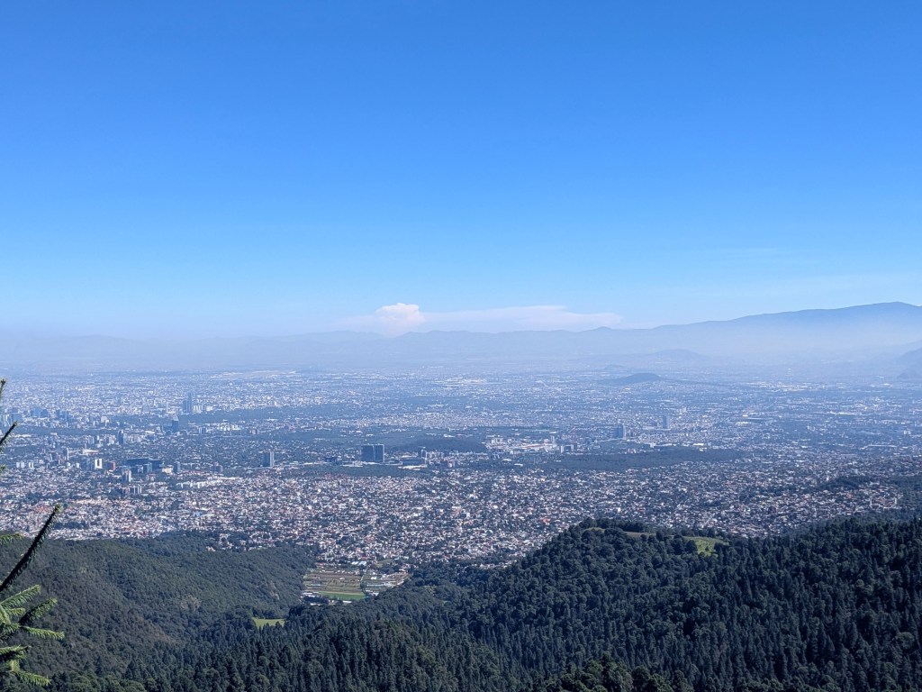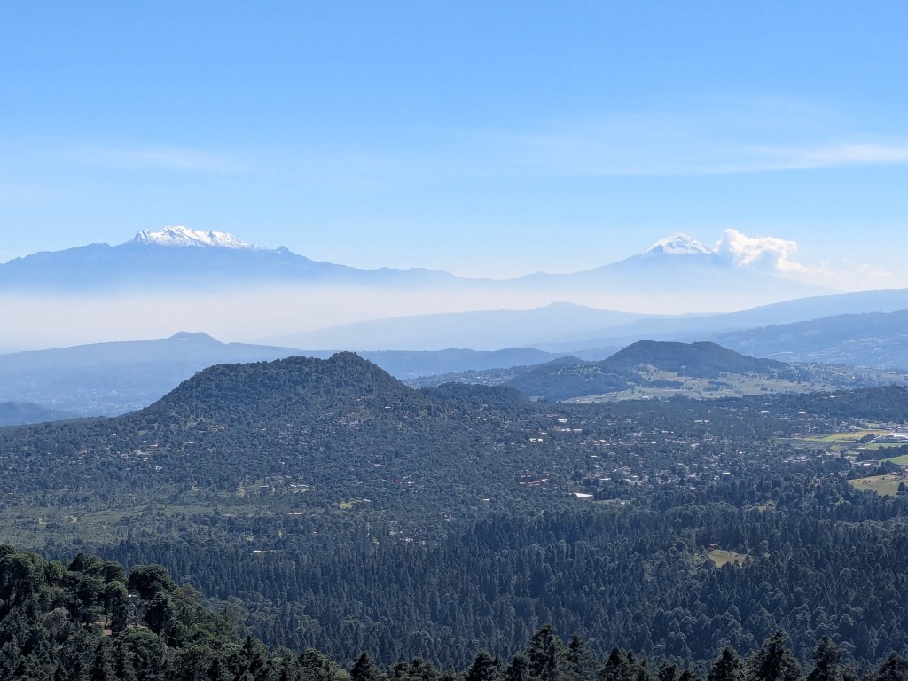 But this was not the end. After having been falsely assured by Liz that the rest was easier, we continued going up. Michelle and I agreed it was even perhaps at a steeper gradient. We then turned off to Ahuejito, which led us to a narrow and padded in pine needles trail that felt more hikinglike. A small clearing gave us an incredible view of the city, Iztaccihuatl & Popocatepetl.
