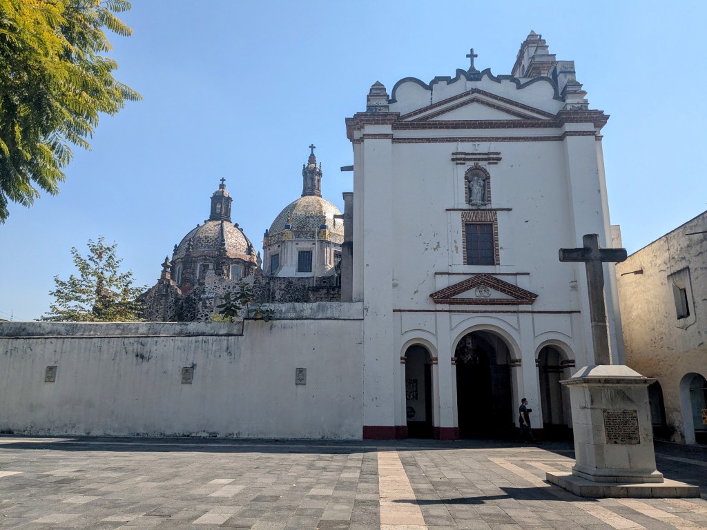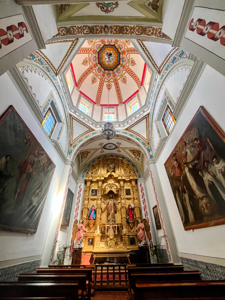 Saturday I wandered down to San Ángel and for the first time took the metrobus down there. I knew it was easy, but I was pleasantly impressed with how easy. Both coming and going a bus arrived within moments. Six pesos and 30 minutes later, I got off in San Ángel across from Parque Bombilla and climbed a few uphill blocks to the central plaza. As always on Saturday, it was filled with art. This is a really lovely old part of town with narrow cobblestone street, lofty Spanish style mansions and gates and brightly colored homes. It’s not unlike Coyaocan, in fact, the two houses of Diego Rivera & Frida Kahlo are located in this part of town. I ran my errand and then headed back down to the bus stop. I crossed over to explore Templo del Carmen de San Ángel (although I didn’t go to the adjacent museum, being a bit tight on time). My photos do not do it justice. The church was constructed in the early 1600s for the order of Discalced Carmelites, which is an order focused on prayer, community, and service, although apparently the literal translation is Barefoot Carmelites, which makes it feel like a Tom Robbins creation to me. It was built in the colonial Baroque style with some traditional elements incorportated into a European style building. There are actually three domes all of which are covered in bright ceramics. It’s an active church and while I was there a woman was kneeling at the altar and singing her prayers quite loudly. But she had a lovely voice.
