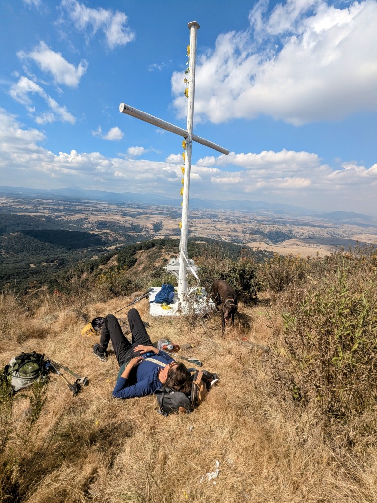 We finally arrived at a crest of the hill and here the ground was yellowed grass rather than bramble and there was a bit of trail or at least clear space to walk. We proceeded up the crest toward the cross atop the hill.