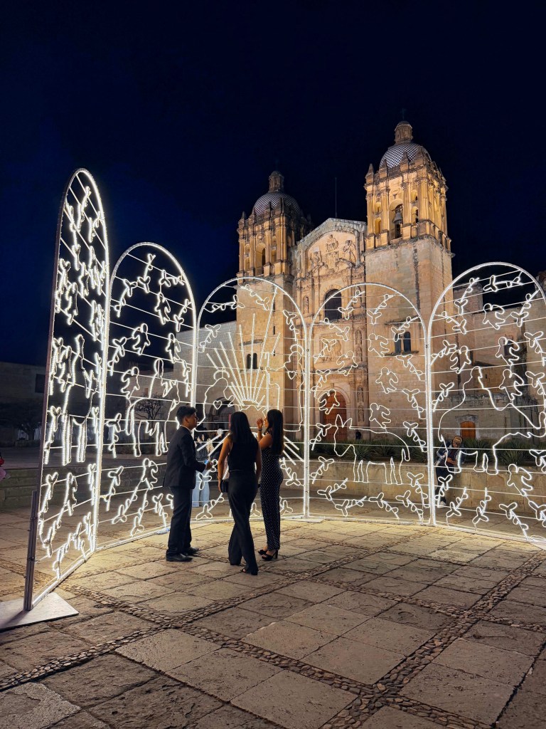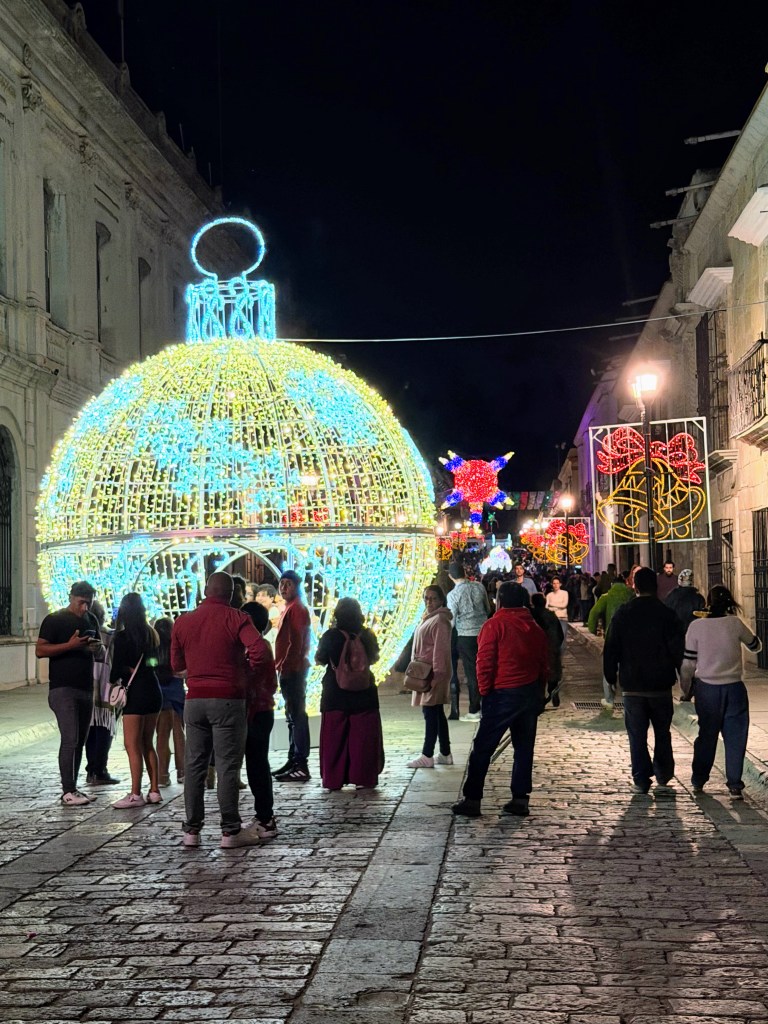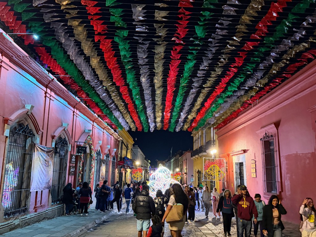 ;Christmas in Oaxaca is a festive affair with the main street featuring light displays and overhead decorations. This night we also came across some singers performing Ave Maria. The man in particular had an incredible rich and deep voice and it was a moving performance that attracted a crowd. There was no sign at the church nor at the zocalo of any gathering. Our confused walk up and down featured extroardinarly loud firecrackers on a regular basis in addition to the noise of the crowd and general merriment. Eventually I asked a police officer about a parade and in a sign of how much my Spanish has improved I was able to identify the word I didn’t know, calenda. Which it turned out my mom had just read about.