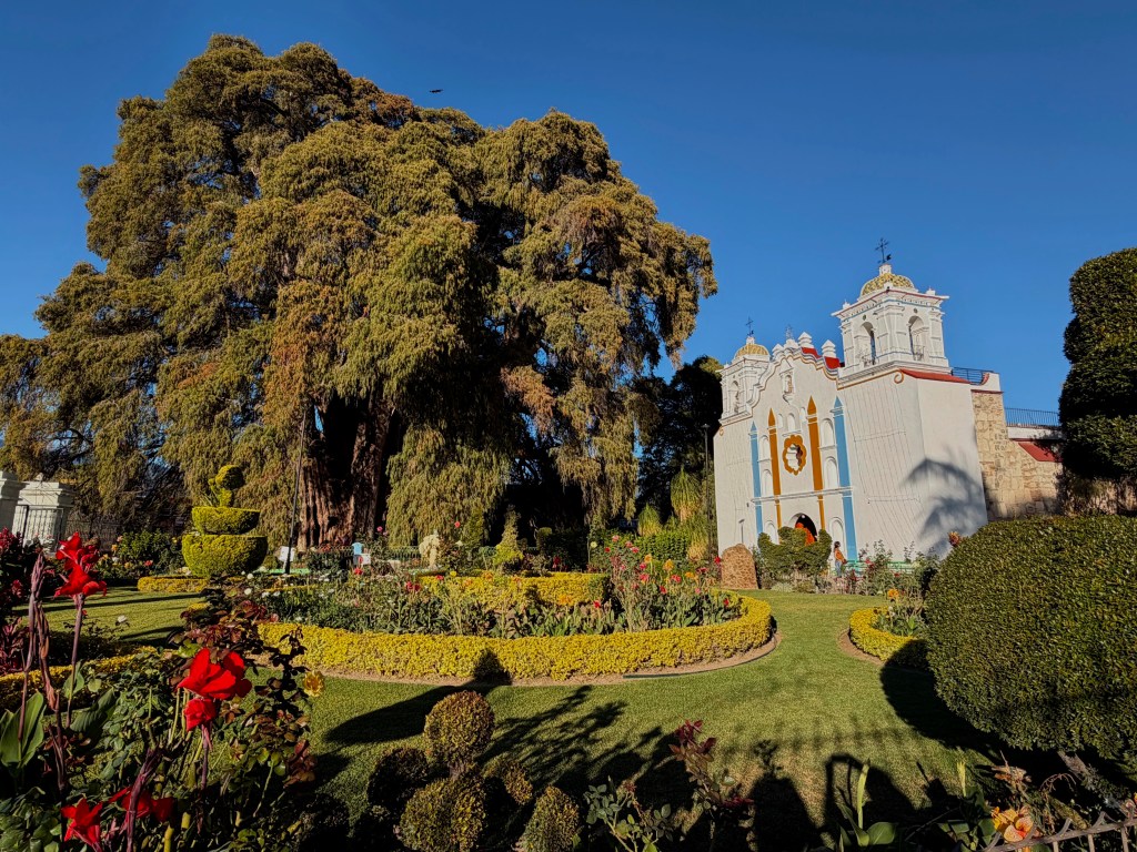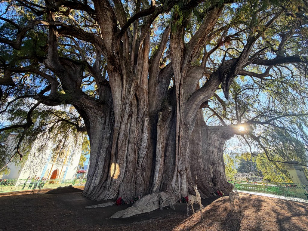 Afterwards, we made our last stop of the tour at Tule tree, the widest tree in the world. Located in Santa Maria de Tule, the tree is a sacred spot that Spanish couldn’t cut down, so they just built a church next door. There’s some argument over how to measure the diameter of the tree since it isn’t one smooth round surface, most generously it boasts a 46 ft diameter, or, if smoothed, just over 30 ft. Either way, it wins as the next widest tree is only 29 ft in diamater. While no one knows how old the tree is, most estimates place it around 1500 years old. Tule is an ahuehuete tree, a Montezuma cypress in English, as I just learned and is also called the Tree of Life as people point out various animals they can find in the trunk.