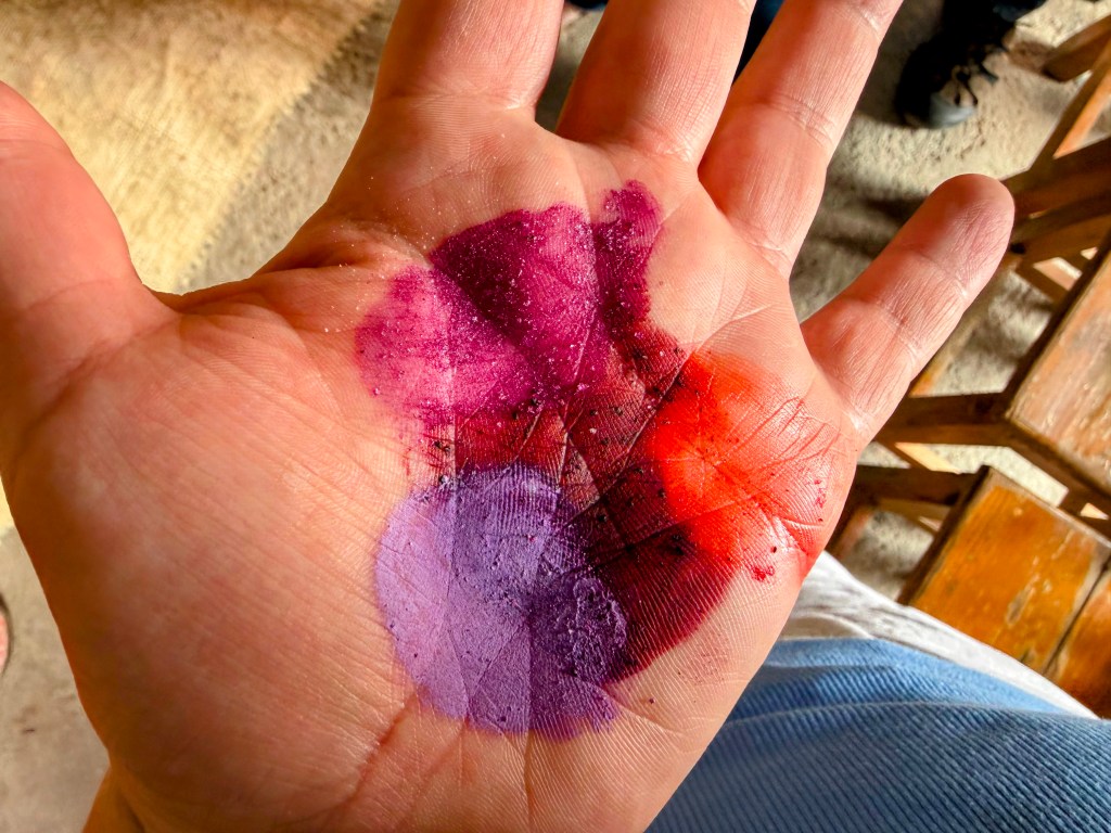 This was definitely a more rugged event that I might have planned for my parents. However, we arrived and were warmly greeted by the family. This was a manicured and industrious operation. The exhibition space was well laid out with chairs, we were each given a small cup of mezcal and had more bugs crushed on our hands. We had an opportunity to try carding (that’s a pain in the ass) and use a loom and a whole wall showed the variety of dyes that could be produced using the area’s wildlife.