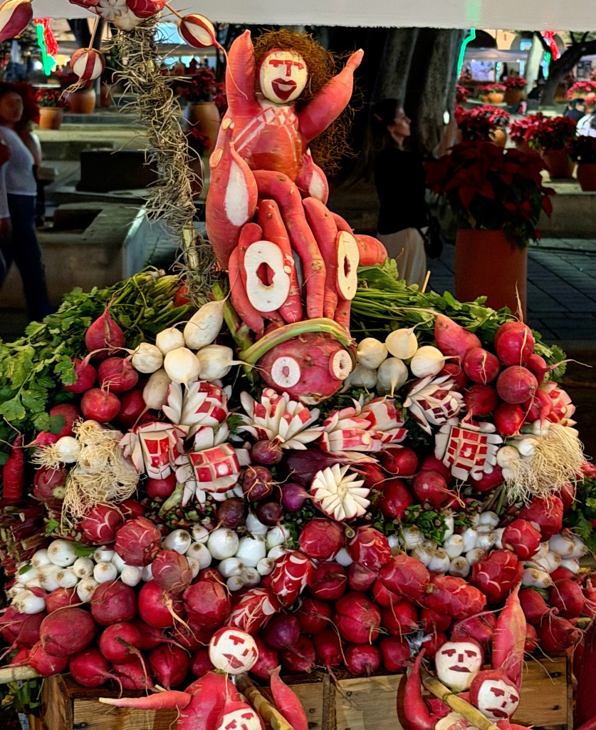 The line stretched for blocks around the zocalo. As the primary question had been “are we seeing radishes before AND after dinner or just after”, I bounced up to the front of line to inquire about closing time and much to my delight overheard a conversation about the special (read: nonexistent) line for older adults. I immediately produced my older adult and we were in!