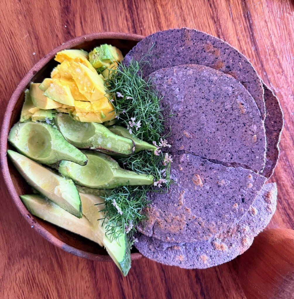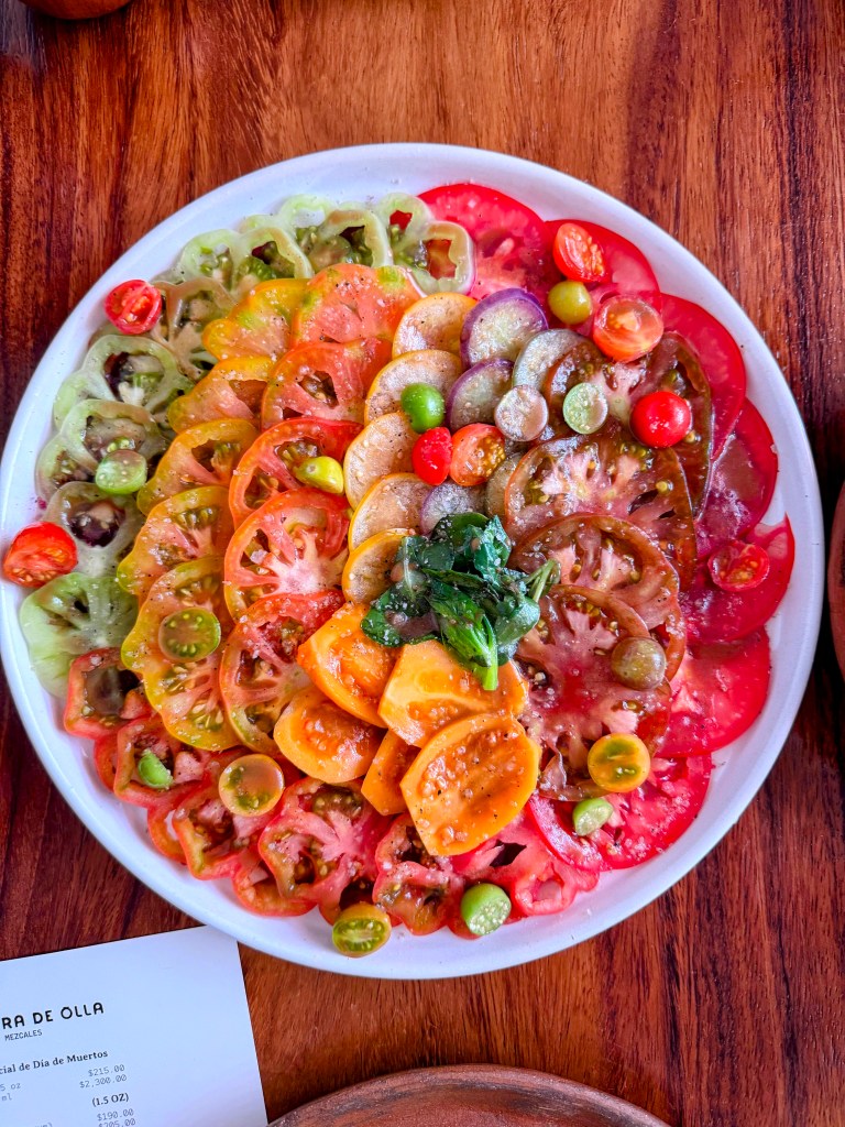 The space is beautiful in a charming colonial with a big open courtyard. Wooden bookshelves line one edge displaying terracotta pottery, big wood and white columns extend to the ceiling and a comal station is featured on one edge. We began with guacamole that comes with agaucate de agua diced in the picture, aguacate criollo which has a skin so thin you can just eat it, and aguacate mantequilla a large avocado with an extra buttery texture. And then of course my darling tomato salad. Followed by a not picture heirloom squash with pipian blanco. Our main was a pork rib with mole that was just fall apart tender and delicious.