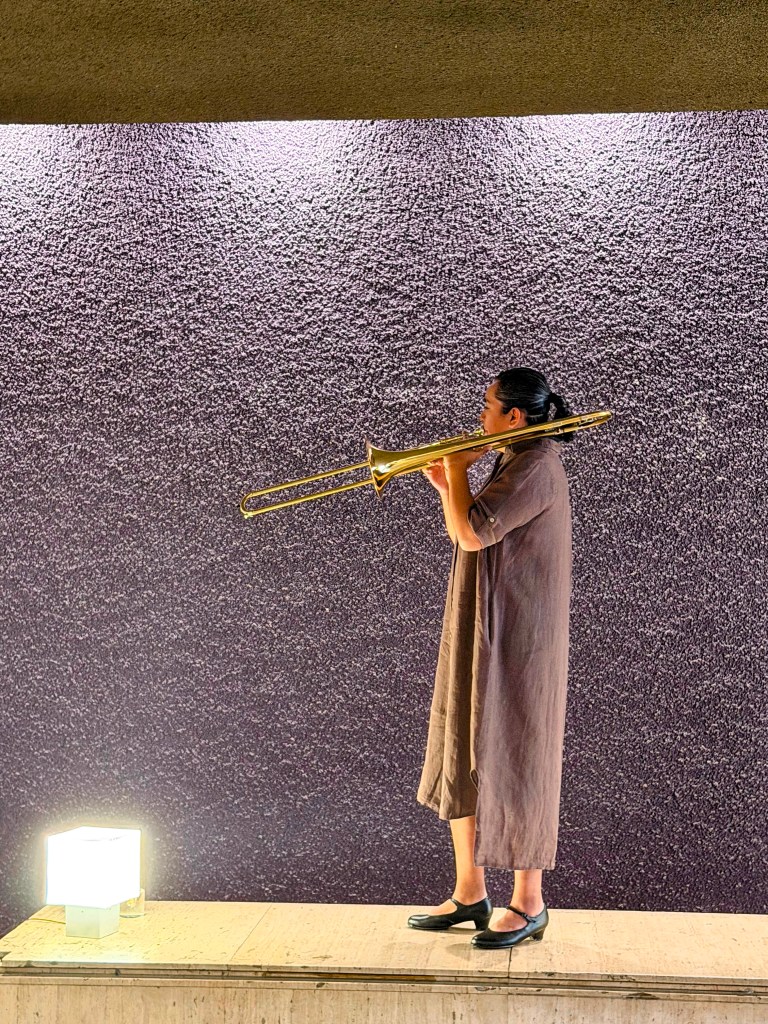 The performance began on the main floor. A single woman with a trombone dressed in a simple woven, shift style dress. Her long black hair in a single braid down her back. She harkened back to an earlier time. She stepped on to the ledge and played a note, then another. Sound rather than music. And then from the stairs above a response. Another woman, drsesed similarly also sporting a trombone began a slow intentional descent down the stairs. Finally a woman with a French horn emerged from the shadows. They each made their own discordant sound. They moved slowly and the room felt the calming effect. Two additional women sans instruments emerged through the crowd. Then from below us a heavy bass note.