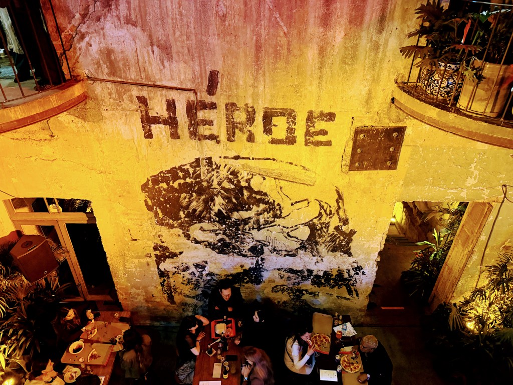 To get to the third floor you follow way too many people up a rickety wooden staircase that wrapped around the edges of an atria and a wooden canoe hanging in the middle. I kinda want a blueprint of this place. It was pretty incredible. On the top floor there’s a roof top bar.