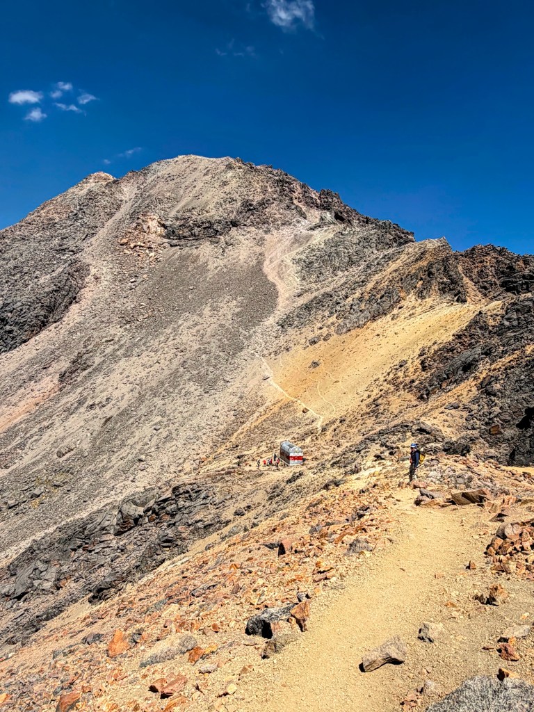 We arrived at the Refugio with the sun high over head. My next goal is to ascend to Cruz de las Rosas, which is at the top of the hill in the pic on the far left. It’s all scree. But it’s the half way mark to the summit. We ate our sandwiches and headed back down. Which was hard. The constant focus on your next step was getting exhausting and the icy coldness of the morning had been replaced by a blazing sun. The mental game is definitely a huge component here as sliding down a rocky cliffside was not in my game plan. But it was beautiful and I definitely felt the oxygen increasing on the way back down.