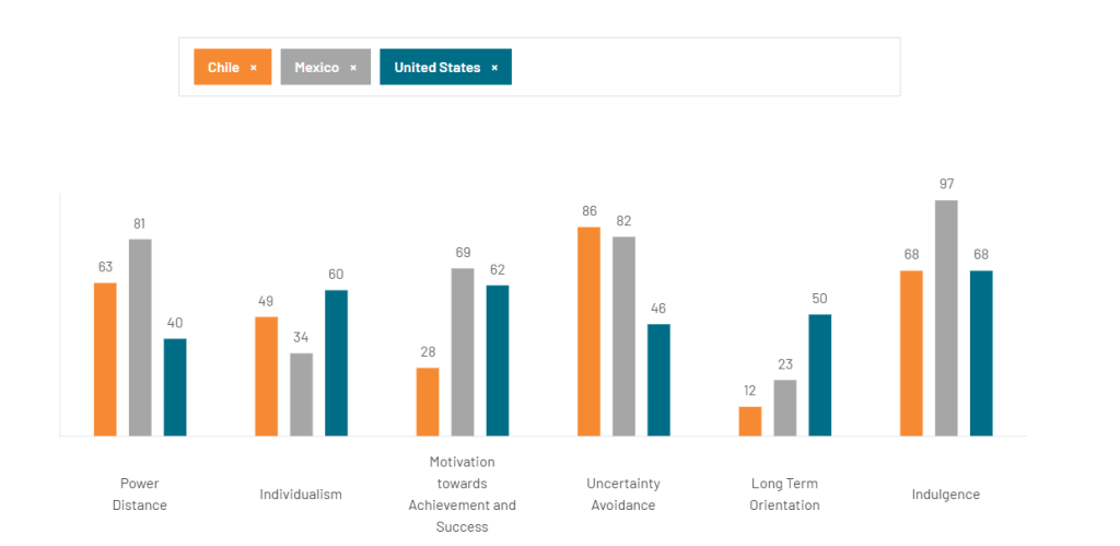 I find this fascinating. Some of the metrics are unsurprising, power distance relates to the perceived impact an individual can have on systems of power, like politics and is thus unsurprising. But I was fascinated with teh idea that Chile is high on uncertainty avoidance as I had some notion that perhaps countries with less robust safety nets would be less tolerant of uncertainty since it is in someways a more fundamental aspect of daily life, but Chile is blowing that idea out of the water.