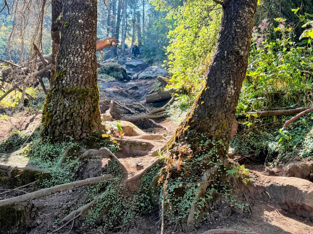 After parking we started up a gentle incline. It was an absolutely beautiful morning, a little chilly, but sunny. The path we took was shady and light filtered through trees and the occassional ruins, presumably from the order. Then, of course, because Liz, we set off into bramble, forging our own path.
