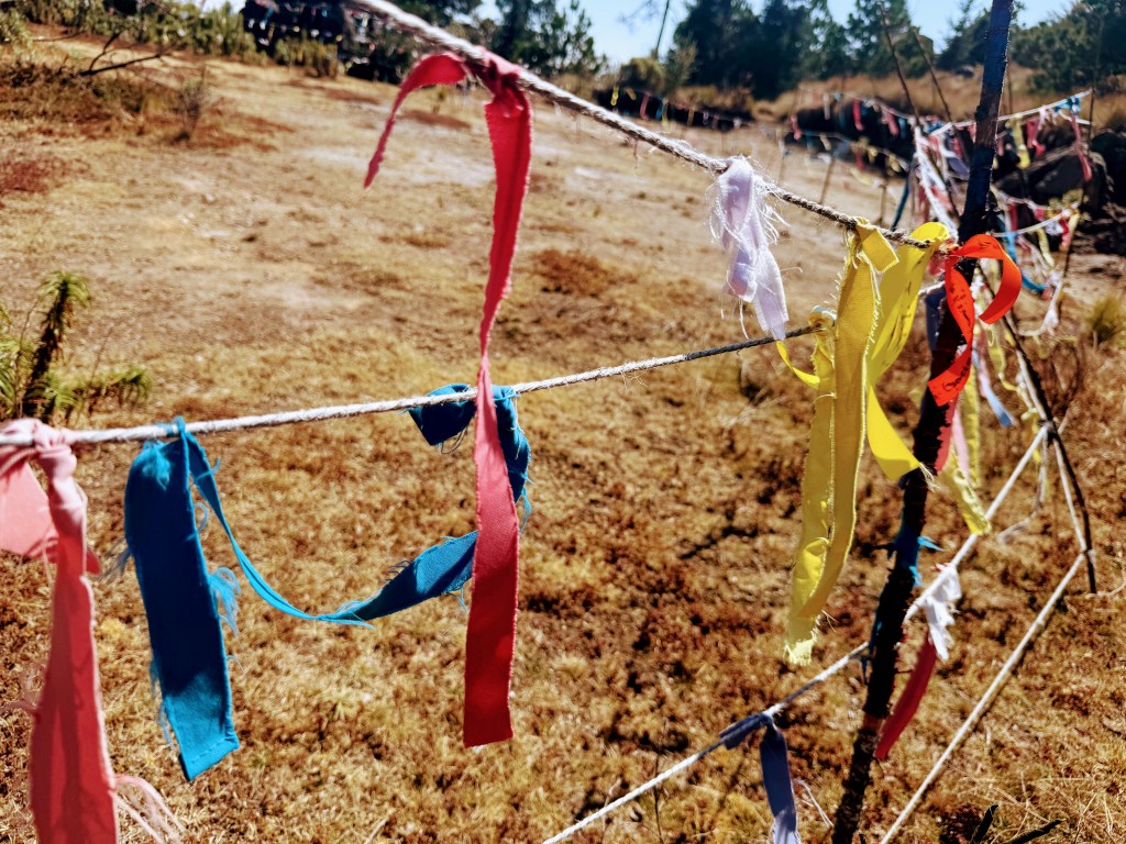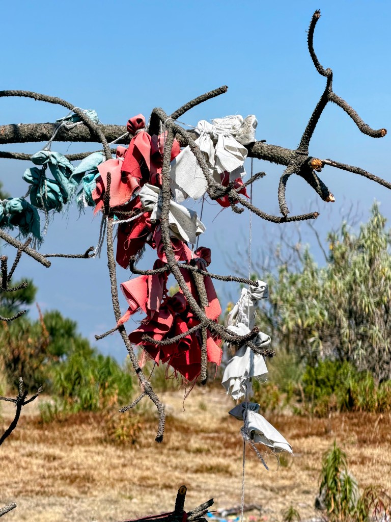 It was a quiet almost sacred place. Flat and barren, but for a decorated and leafless tree in the center of a make shift fence with ribbons tied to it. Liz told us that it was a ceremonial space and that groups climbed to this point for sunrise ceremonies.