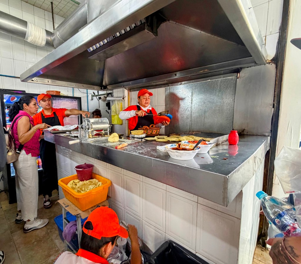 A woman standing on plastic stool on the outside is feeding masa through the tortilla maker, not a press, but crank style and mounted to the counter. Another woman, with a intensely matriarchal presence, mans the rest of the show, separating meat to slap on the griddle and flipping tortillas. She calls out names and orders, holding 5 plates in one arm and a spatula in the other. It is impressive.
